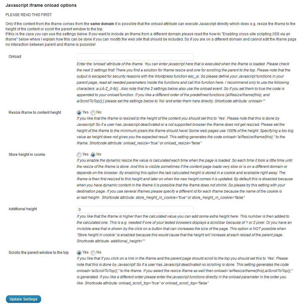 All settings can be set with shortcode attributes as well. If you only use one iframe please use the settings in the administration because there each parameter is explained in detail and also the defaults are set there.