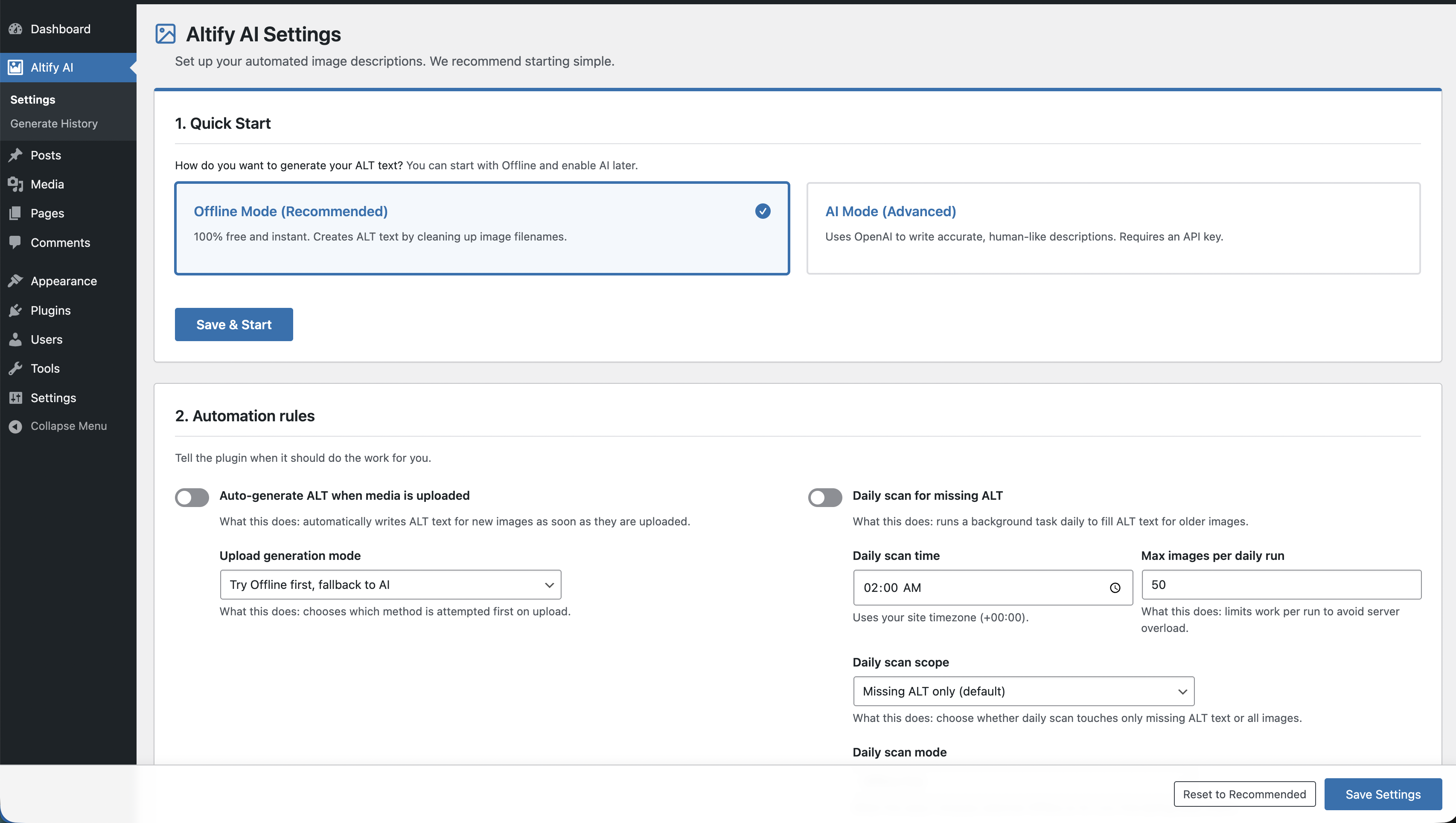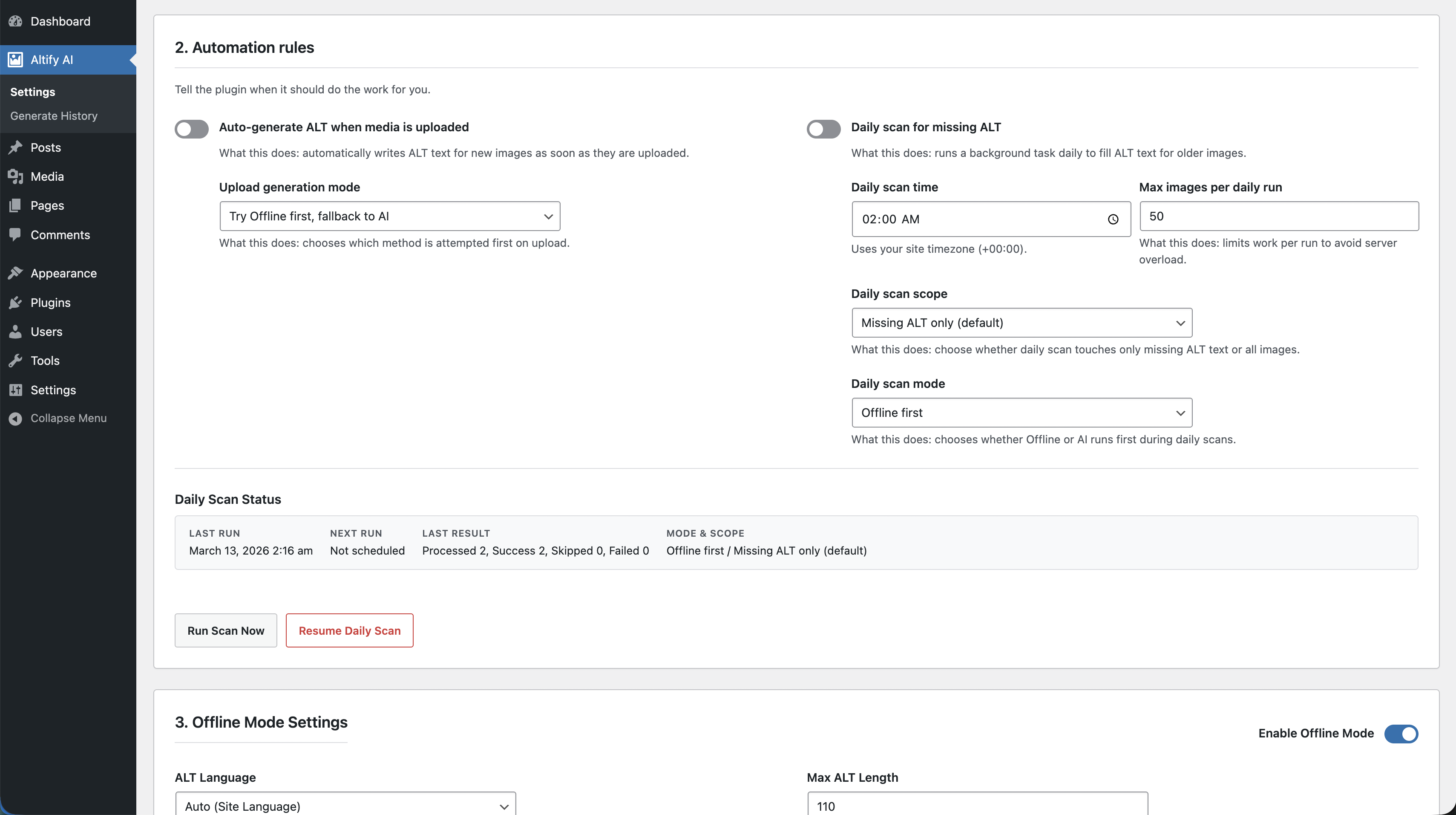 Offline first,AI first,Offline only,AI only). - Daily background scan for missing ALT (or all images) with mode selection, run limit, and status panel.
