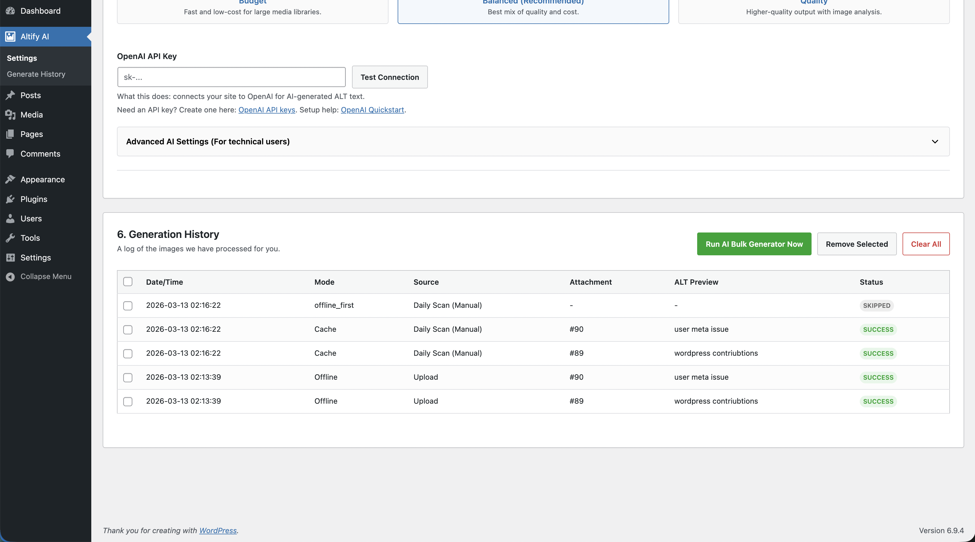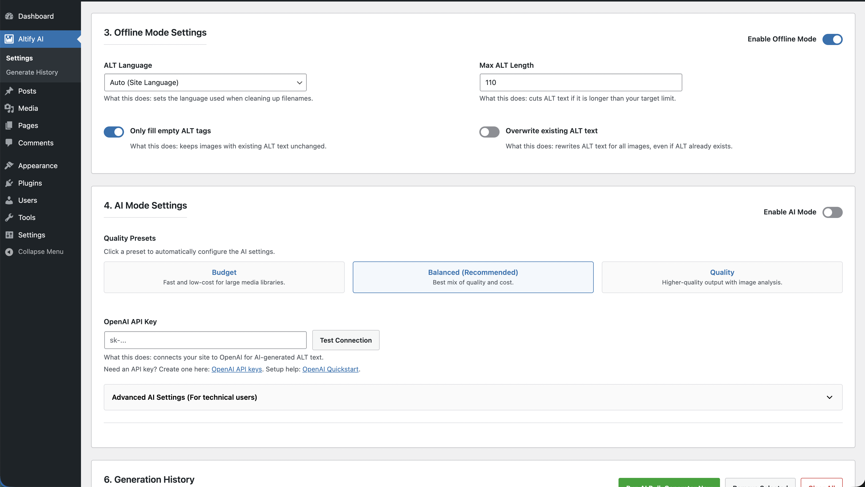 Altify AIadmin menu (before Posts) with dedicatedSettingsandGenerate Historypages. - AI mode with OpenAI model settings, rate limiting, retry/backoff, and safe fallback behavior.
