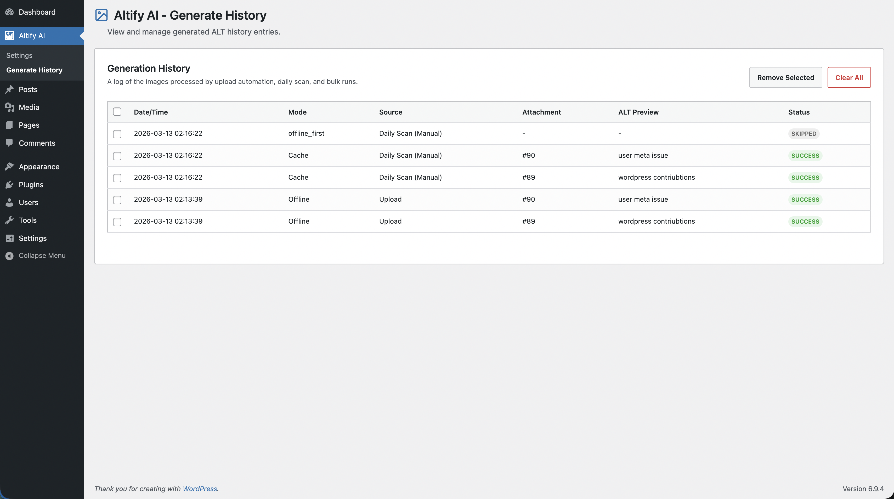 - Generation history table with source, method (AI/Offline/Cache), ALT preview, and row-level delete controls. Settings page shows the latest 10 rows for quick review.