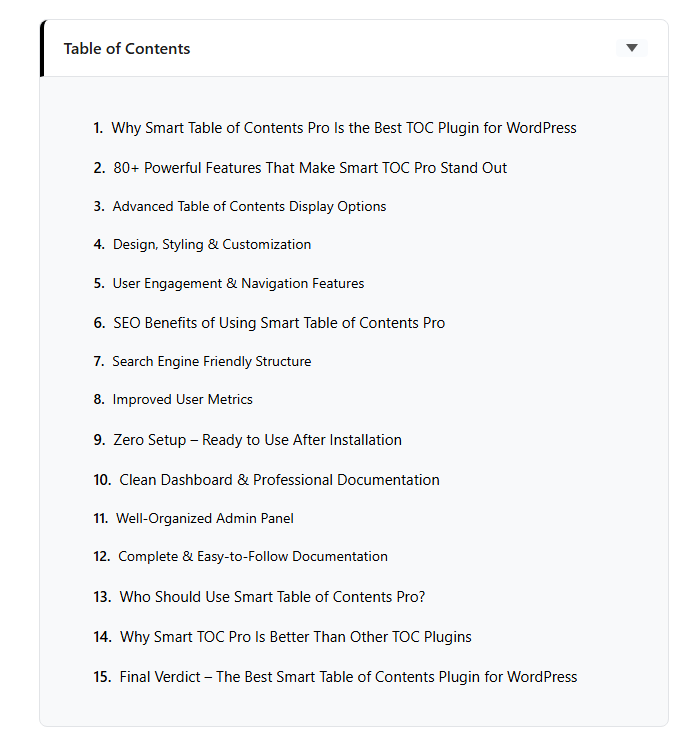 - Collapsible TOC – Visitors can expand/collapse the table of contents