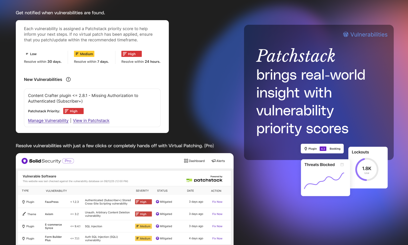 Solid Security now uses the Patchstack Priority score, which goes beyond CVSS to provide a real-world risk assessment tailored to WordPress. It factors in how likely a vulnerability is to be exploited and its actual impact on your site.