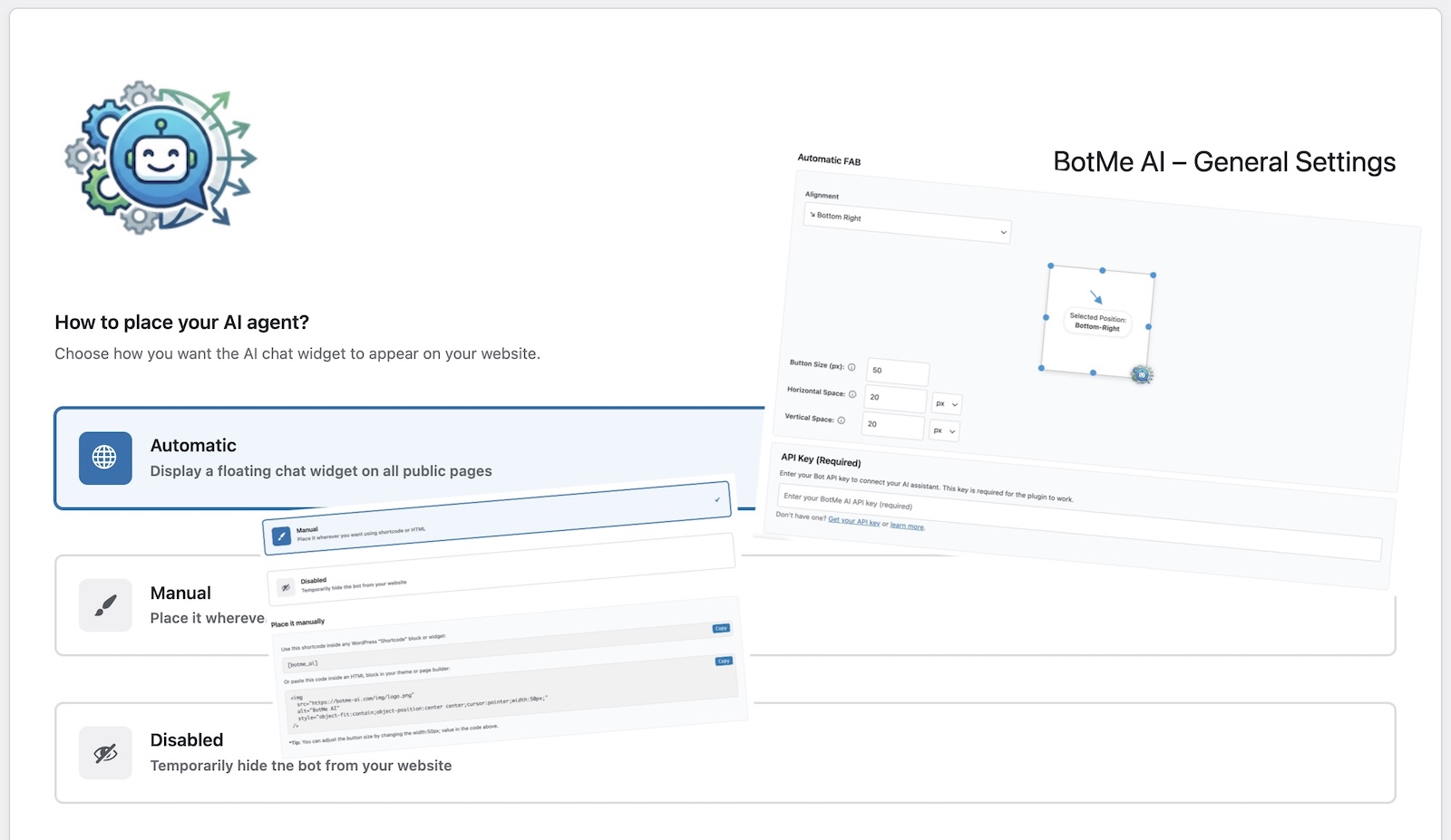 No coding required! BotMe AI is designed as a no-code solution. Simply install the plugin, add your API key, and configure the placement through the settings page.