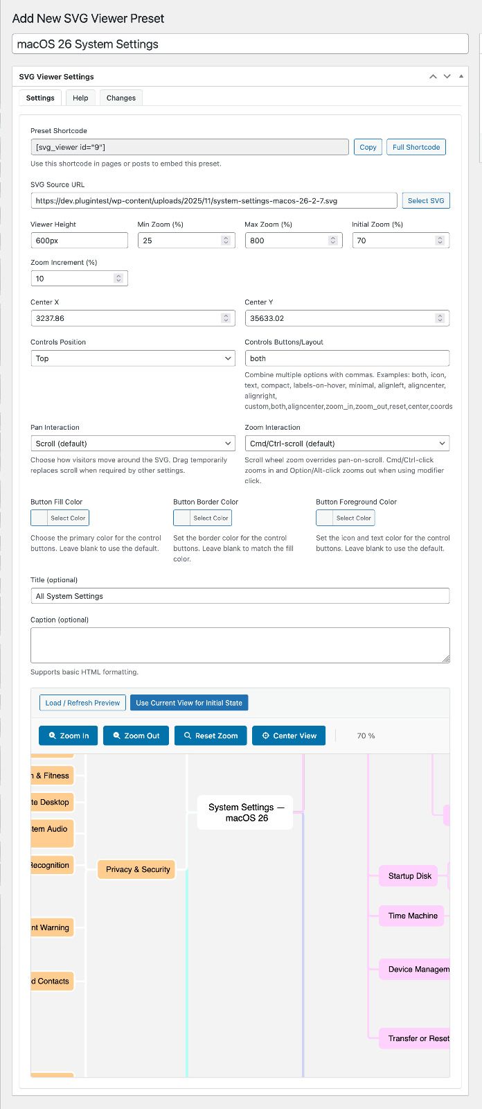 Create a preset from BT SVG Viewer Presets in the admin. Upload an SVG, tune the controls, tweak button colors, then load the preview to dial in the initial zoom and center point. Save the preset and drop the generated [btsvviewer id="123"] shortcode wherever you need the viewer. Inline attributes always win over stored preset values, making it easy to reuse a baseline configuration.