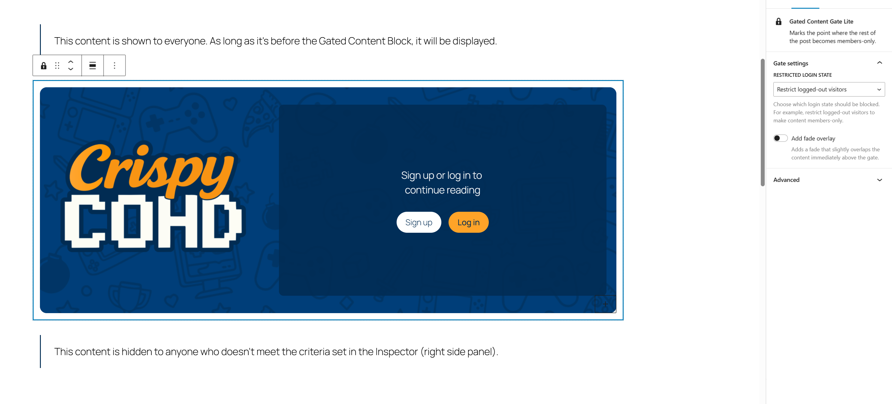 CrispyCohd Gated Content Block provides a secure, block-native way to restrict access to content in the WordPress block editor based on whether a visitor is logged in or logged out.