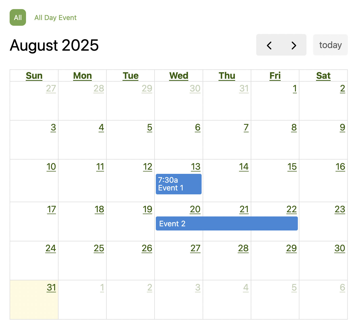 A plugin to display a filterable calendar of events with initial support for Neon CRM.