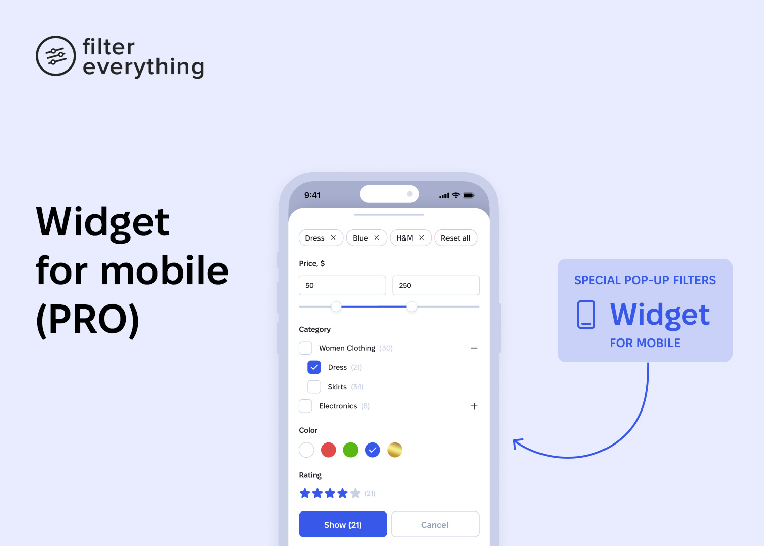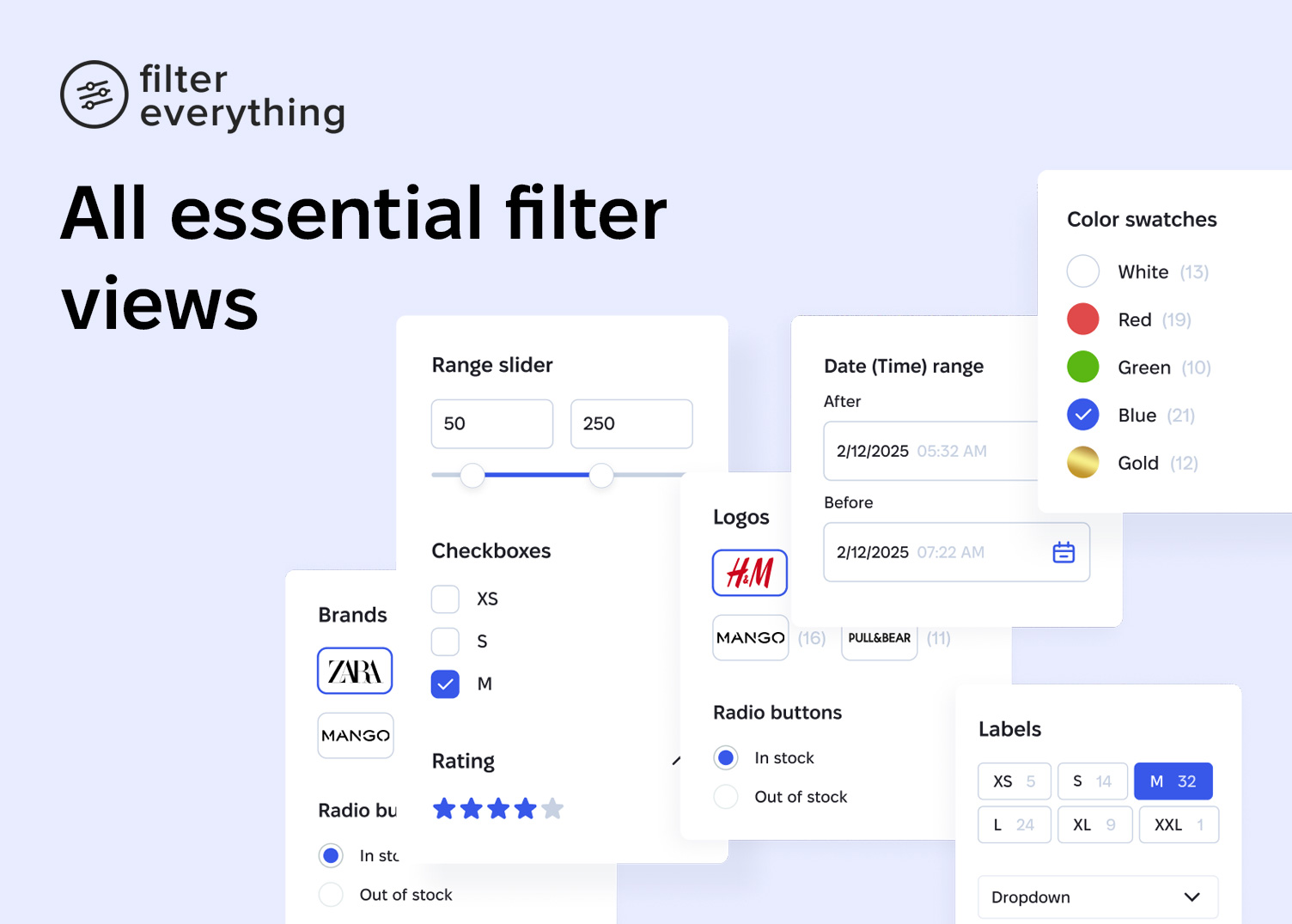 Use checkboxes, radio buttons, dropdowns, labels, color swatches, rating stars, numeric ranges, or date ranges, and display filters as horizontal toolbars or vertical panels. - Flexible filtering modes
