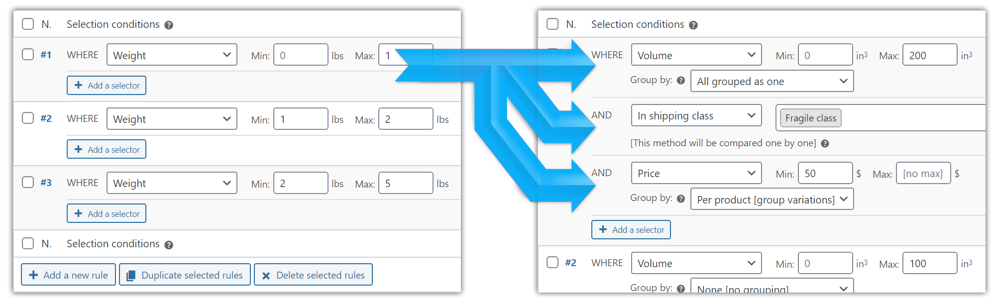 Create complex shipping rate rules by combining multiple selectors as needed, using the AND/OR operator: WHERE [condition1] OR [condition2] OR [condition3] …