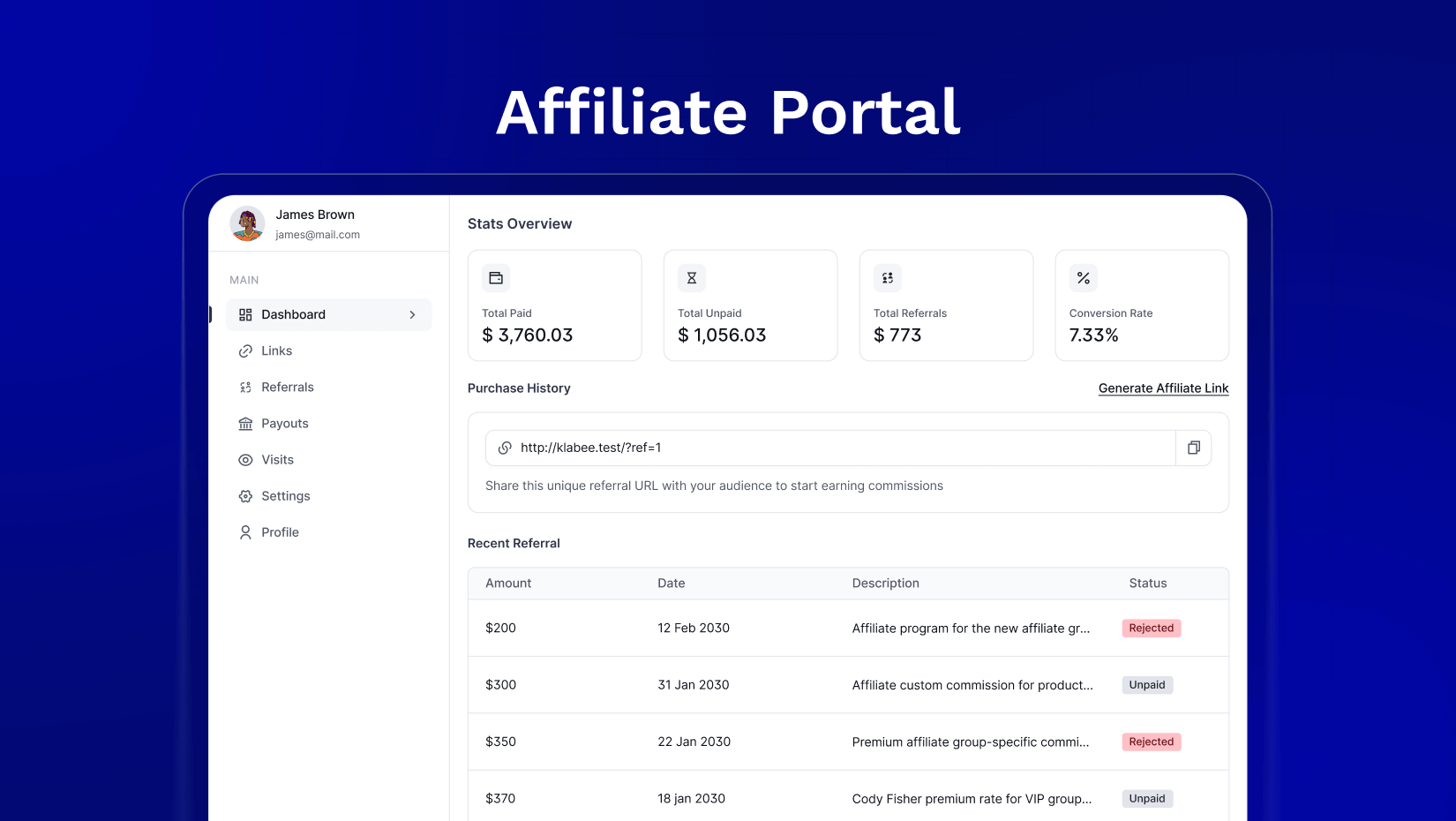 Offer your affiliates a full-featured portal where they can manage their links, view earnings, and stay updated—all without needing to contact you directly.