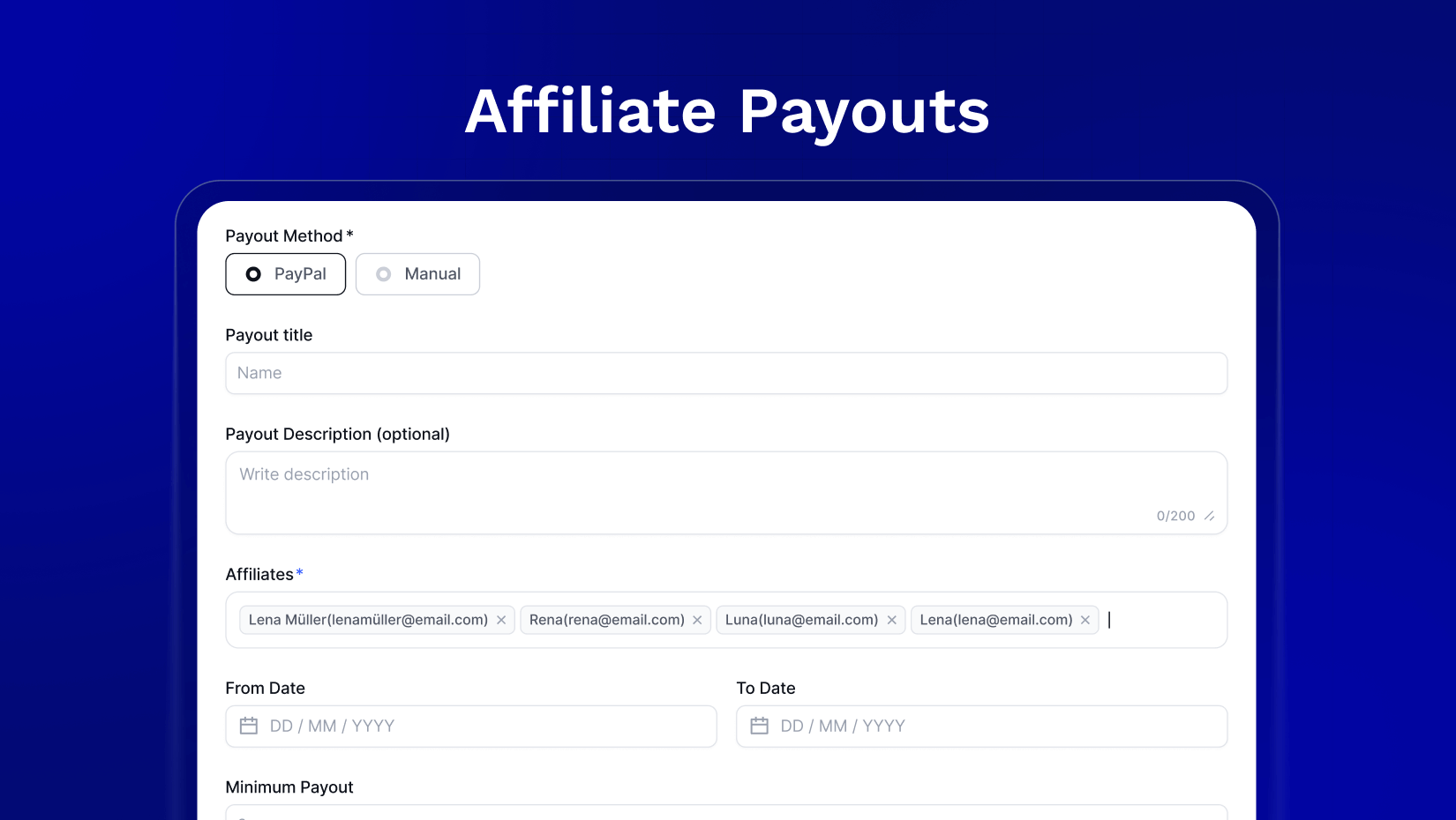 Create payout schedules that work for you and your affiliates. Pay fixed amounts, percentages, or set custom rules to fit different affiliate needs.