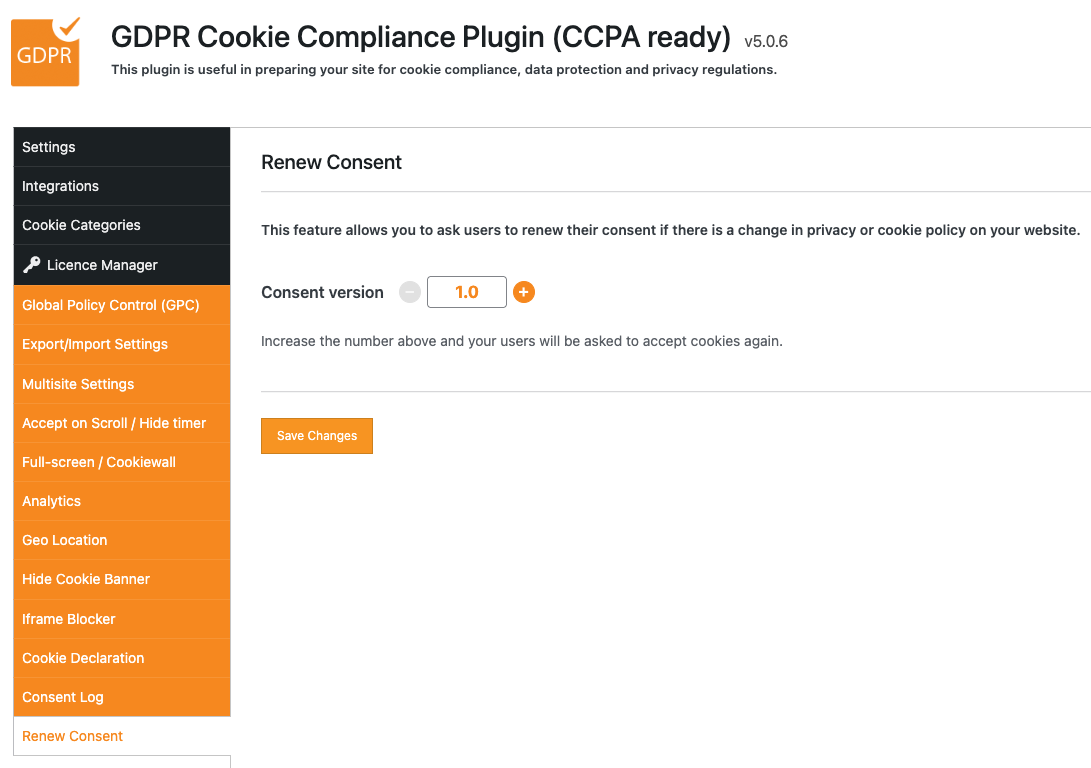 - Renew Consent – ask users to renew their consent if there is a change in privacy or cookie policy on your site