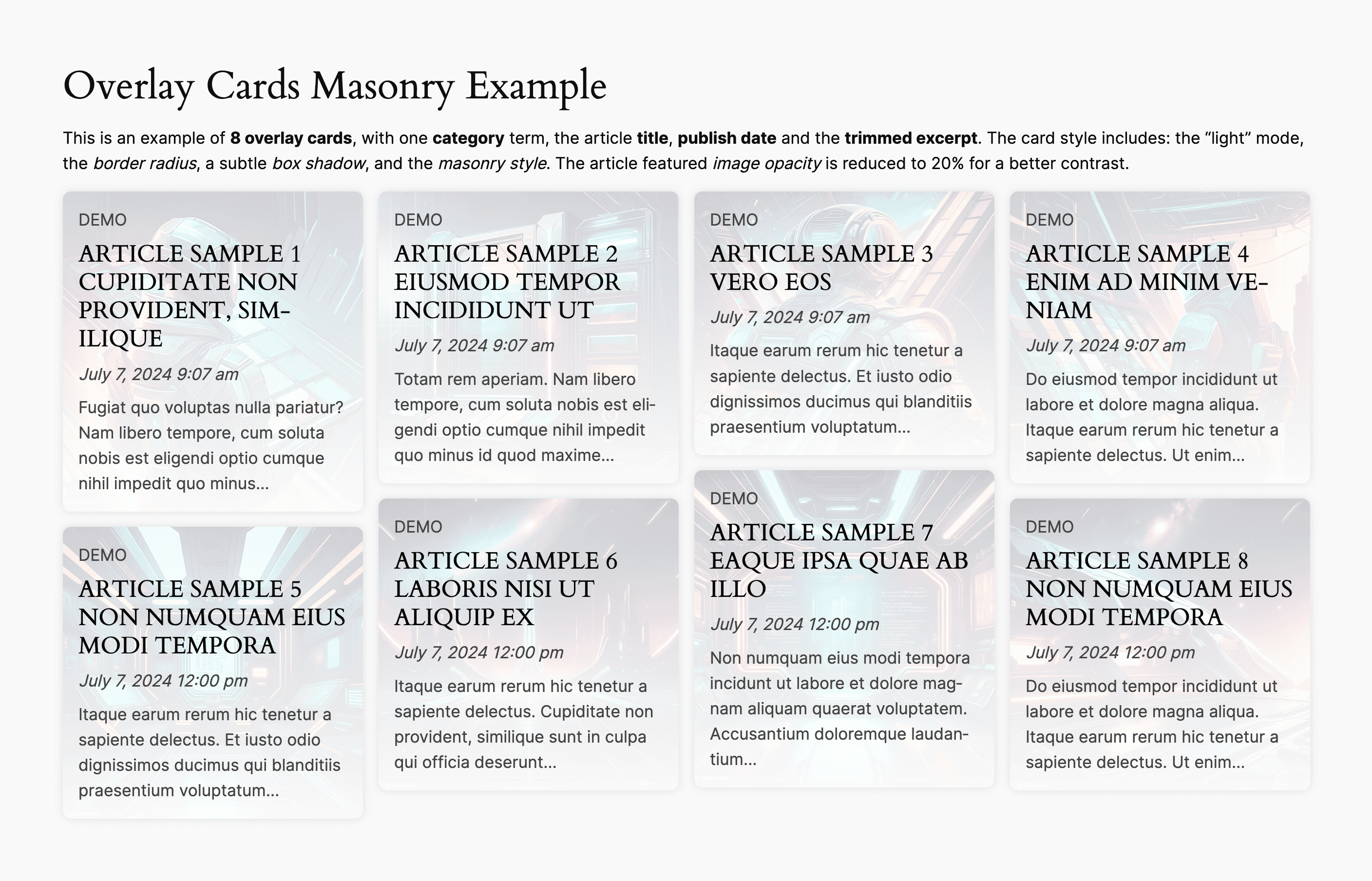 Example of a simple grid with 4 cards per row, with AJAX pagination: