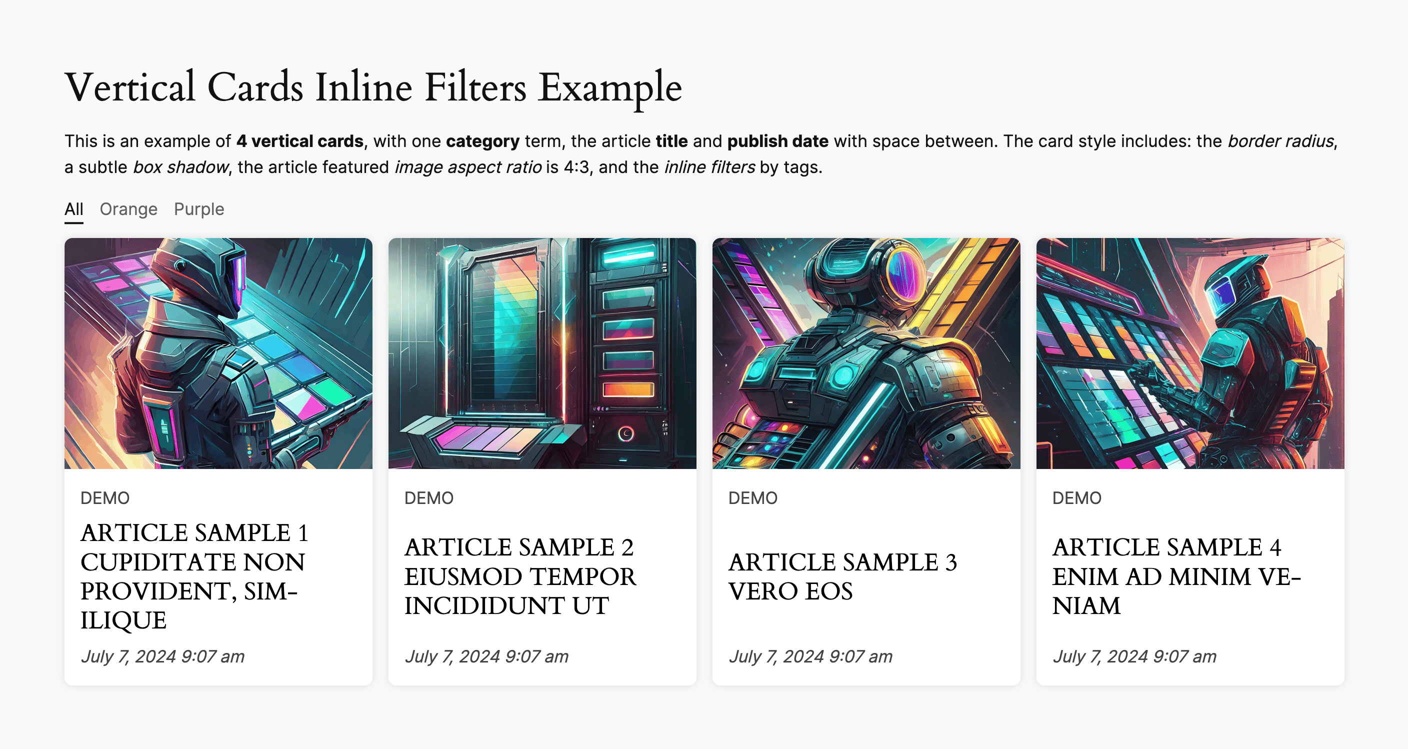 Example of 4 columns grid of vertical cards with inline filters from tags.