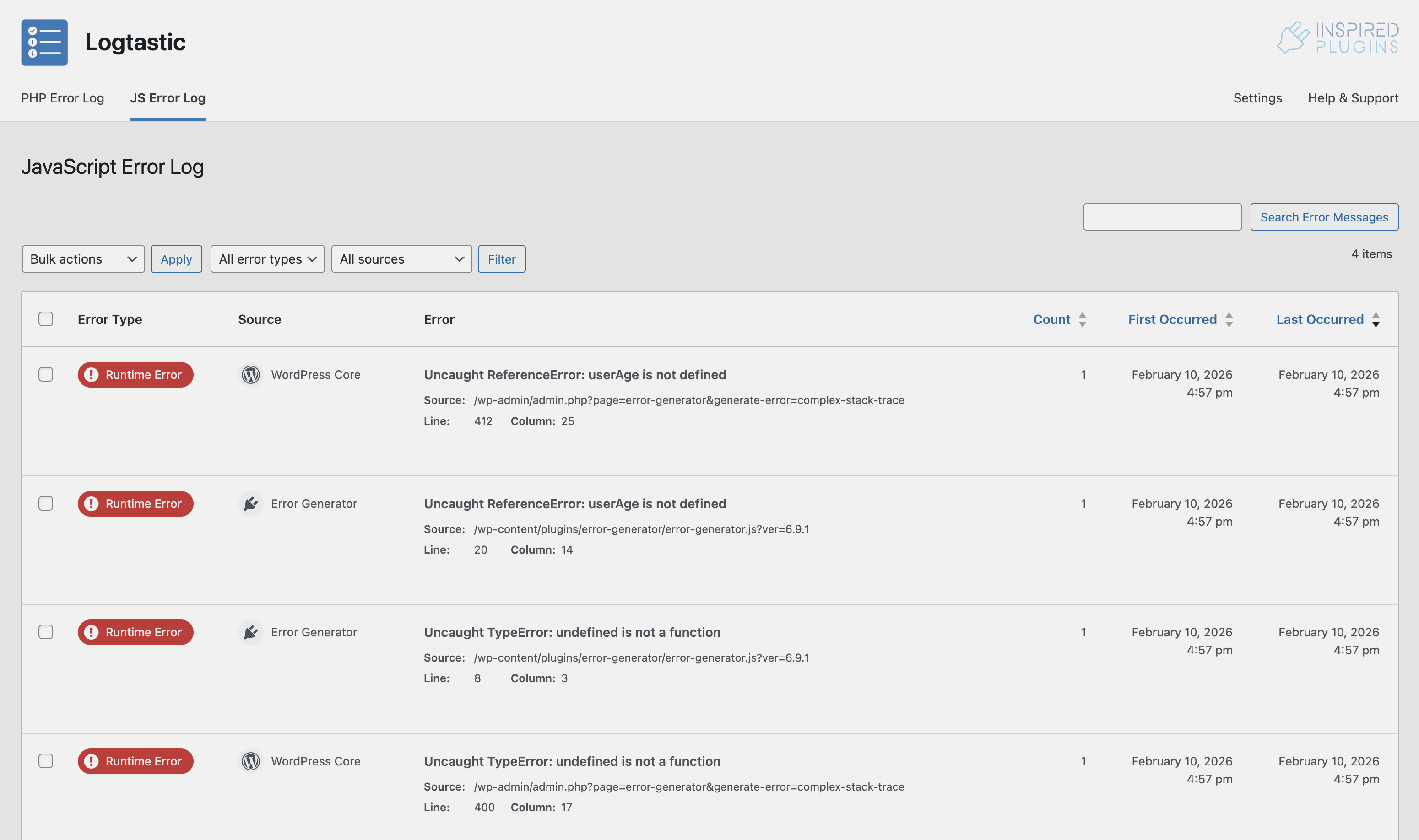 Log JavaScript errors on your WordPress site, with configurable options for error types, scope and log retention. View errors in an easy to digest, searchable and filterable report. Optionally capture full error stack traces and additional session information. Log editing functions allow you to delete and ignore specific errors.