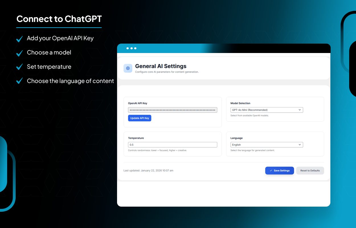 - Easily connect with your OpenAI account by adding your API key directly to the plugin settings.