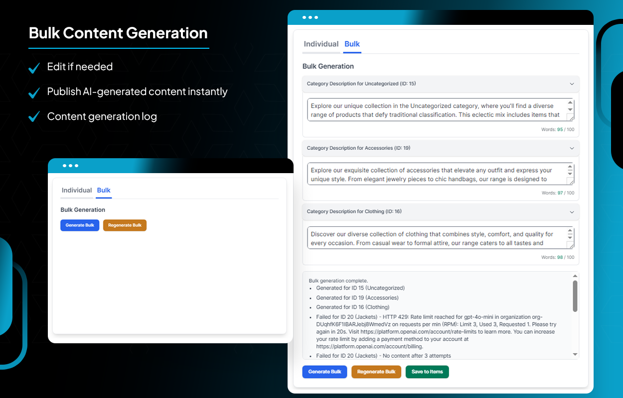 - This plugin helps to speed up the process of generating a large number of product or product category descriptions all at once using a single click.