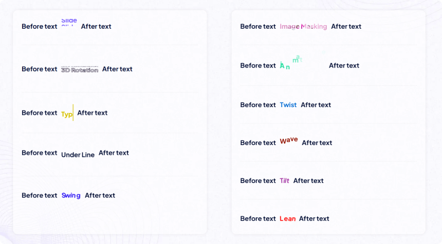 Combines a static heading with rotating words or phrases that roll through the same spot. Set the duration per word, looping behavior, and the number of visible words, and style the title and animated words separately.