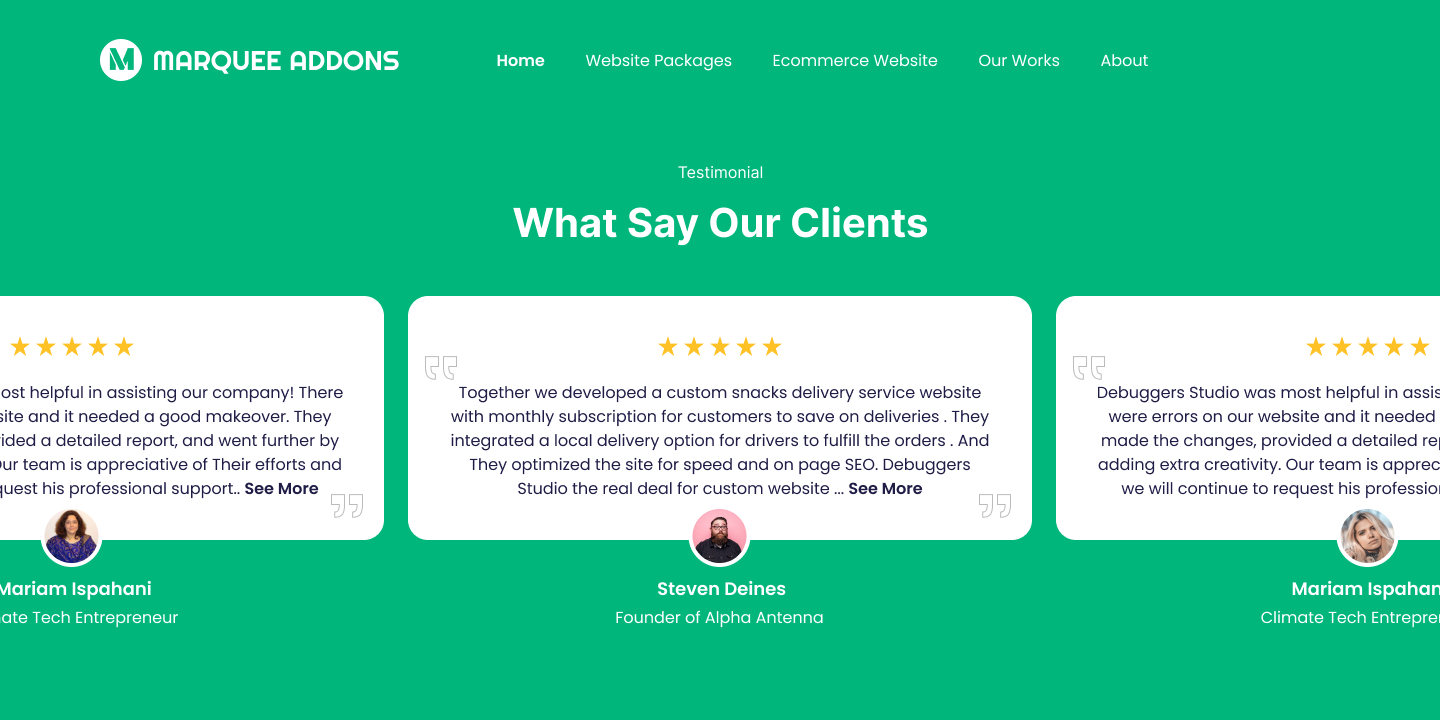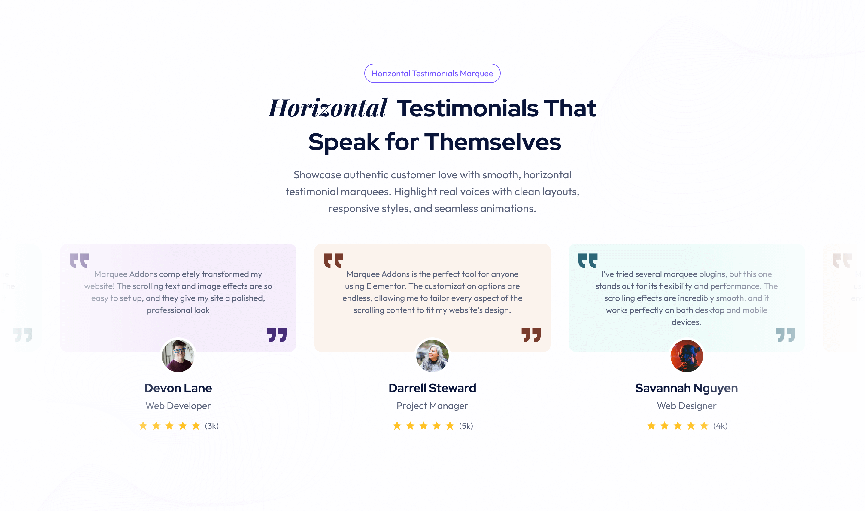 Share client feedback, names, and ratings in a smooth, continuous scroll. A clean and effortless way to highlight customer reviews, build trust, and keep your site looking modern and professional.