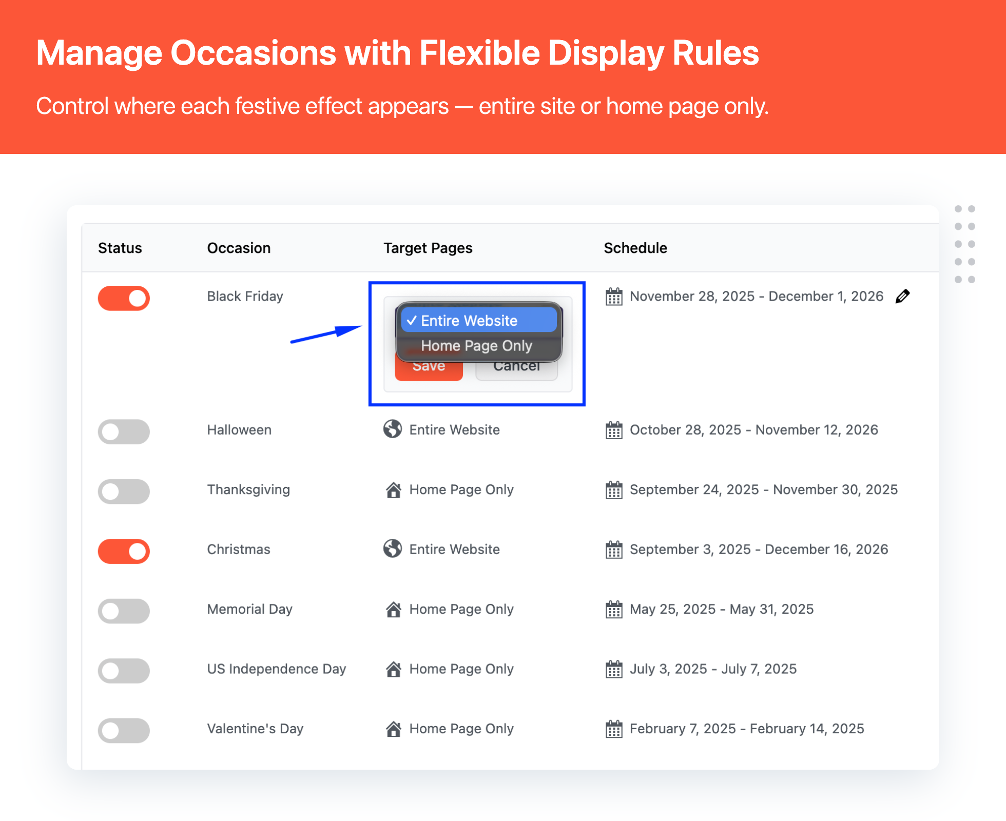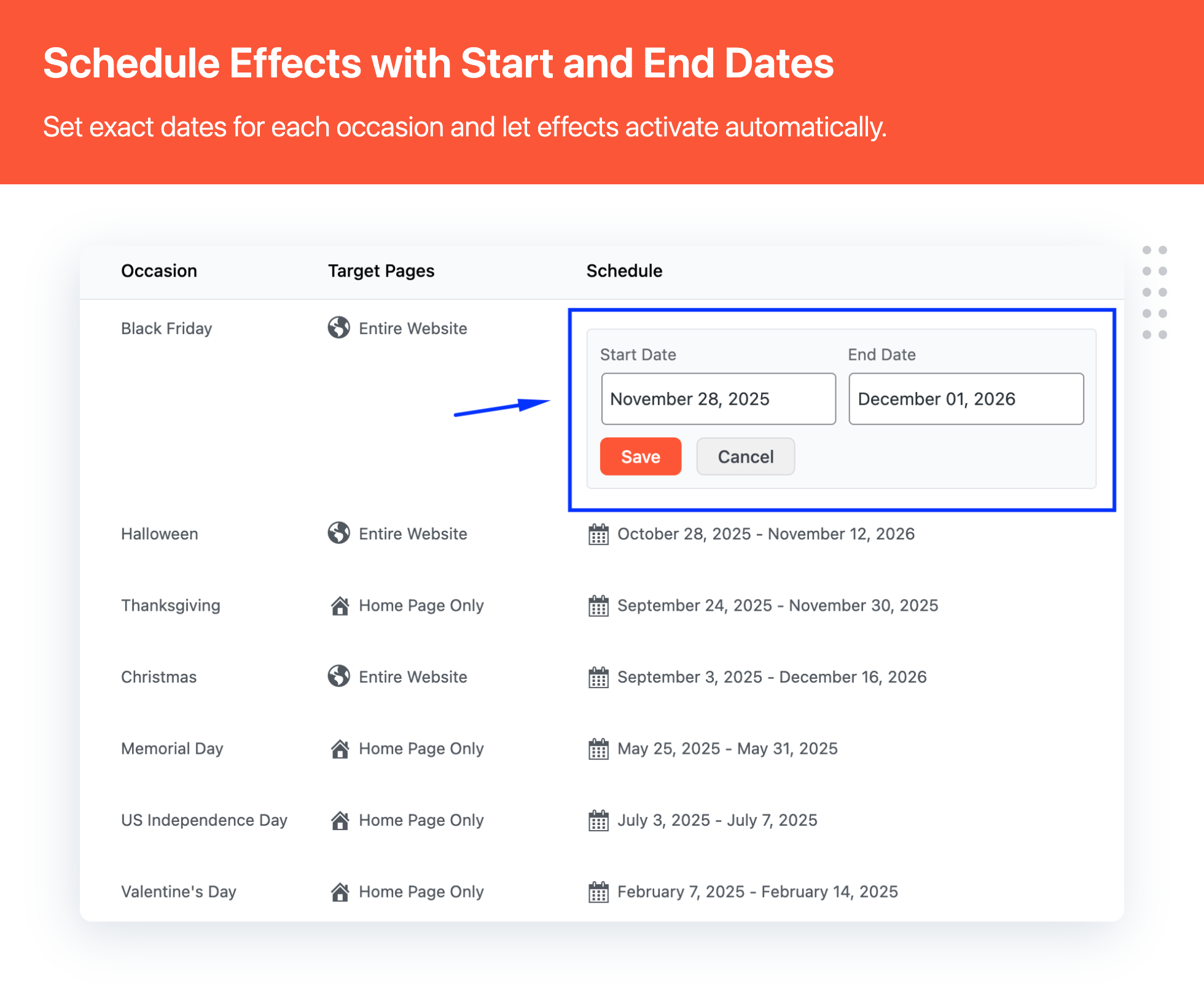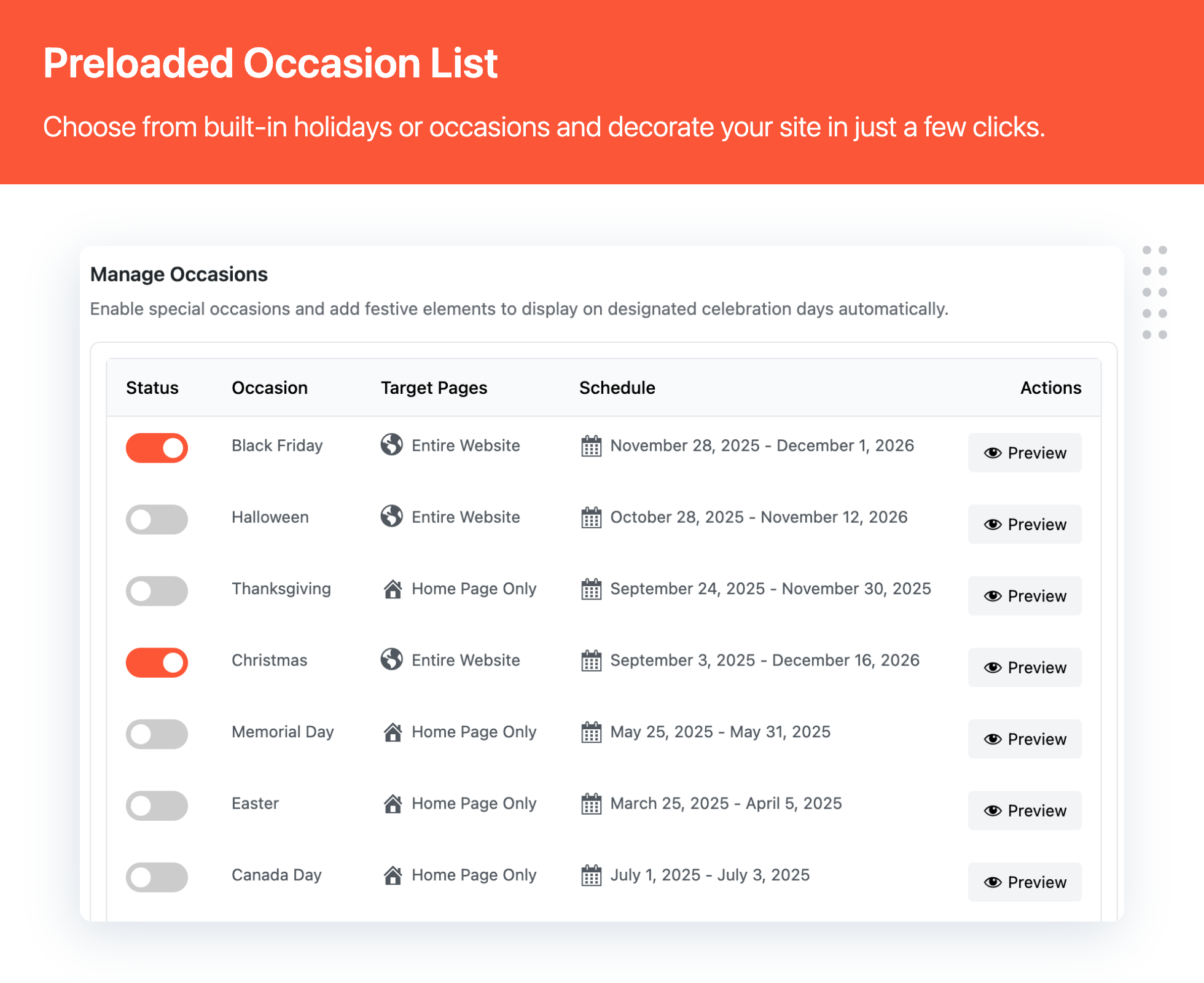 Pick a holiday effect, set the dates, and the decorations will automatically appear and disappear on schedule. No coding. No theme changes.