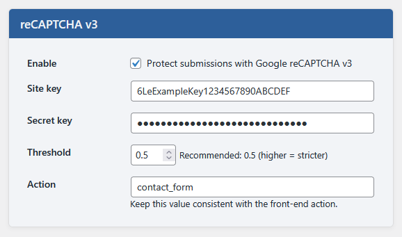 - Optional Google reCAPTCHA v3 (score-based)