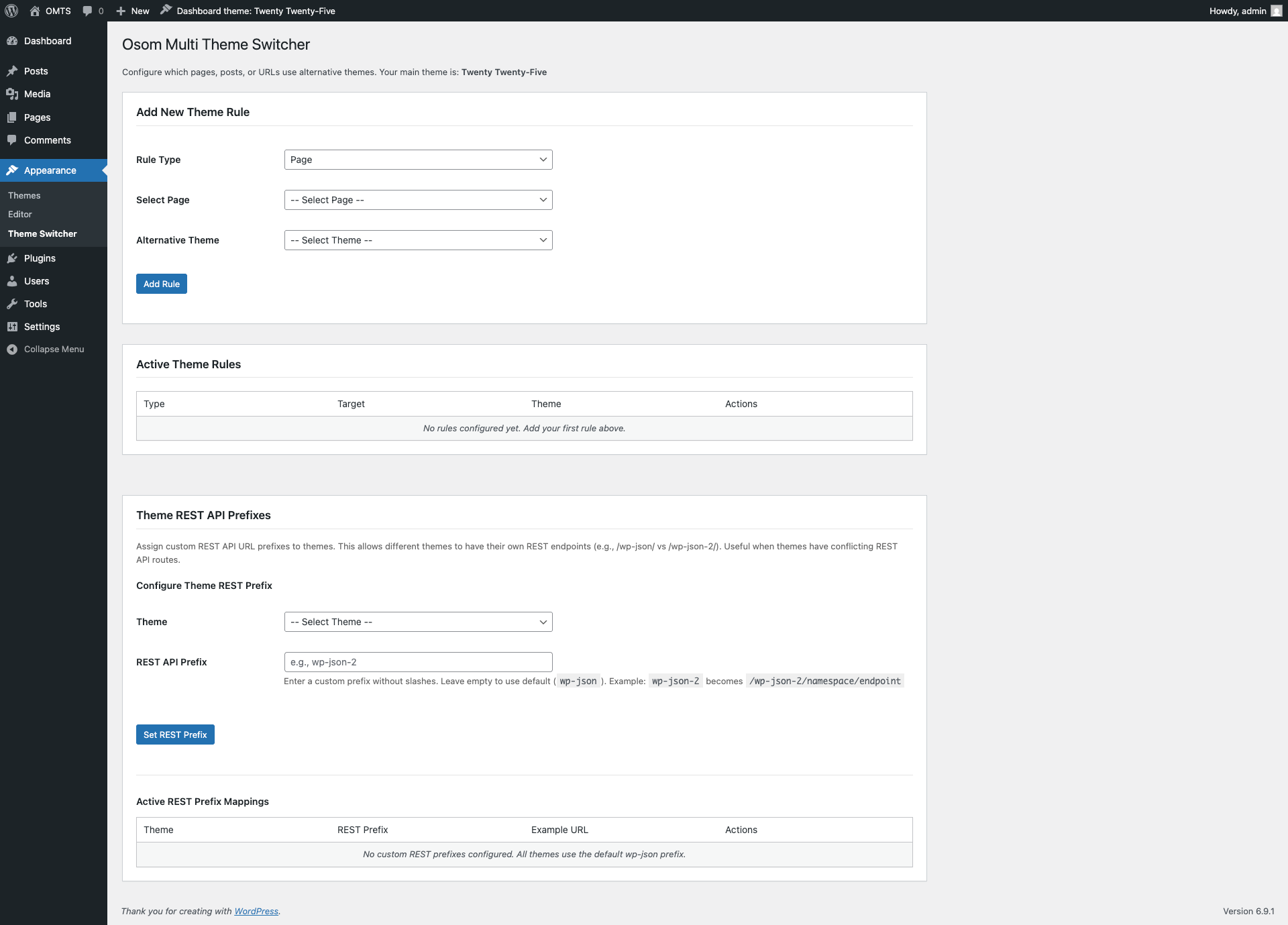 Osom Multi Theme Switcher lets you run multiple WordPress themes on a single site — assigning different themes to specific pages, posts, post types, categories, tags, or custom URLs.