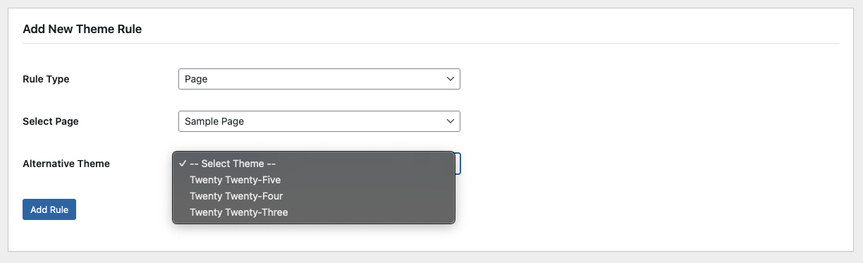 - Flexible rules — assign themes by page, post, post type, custom URL, category, or tag