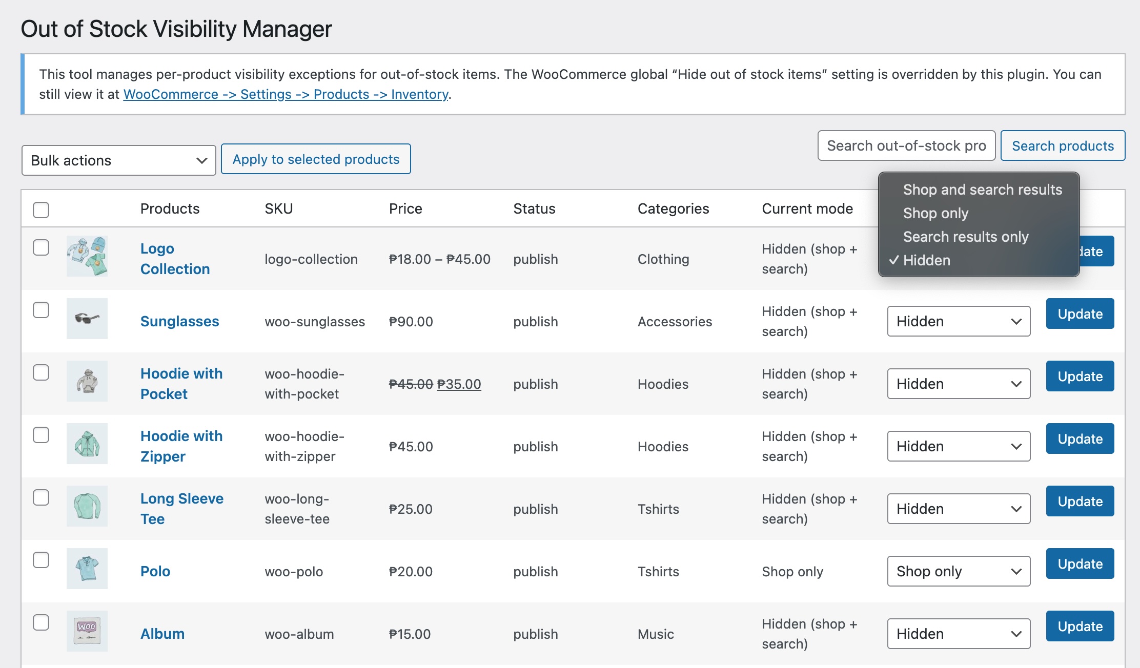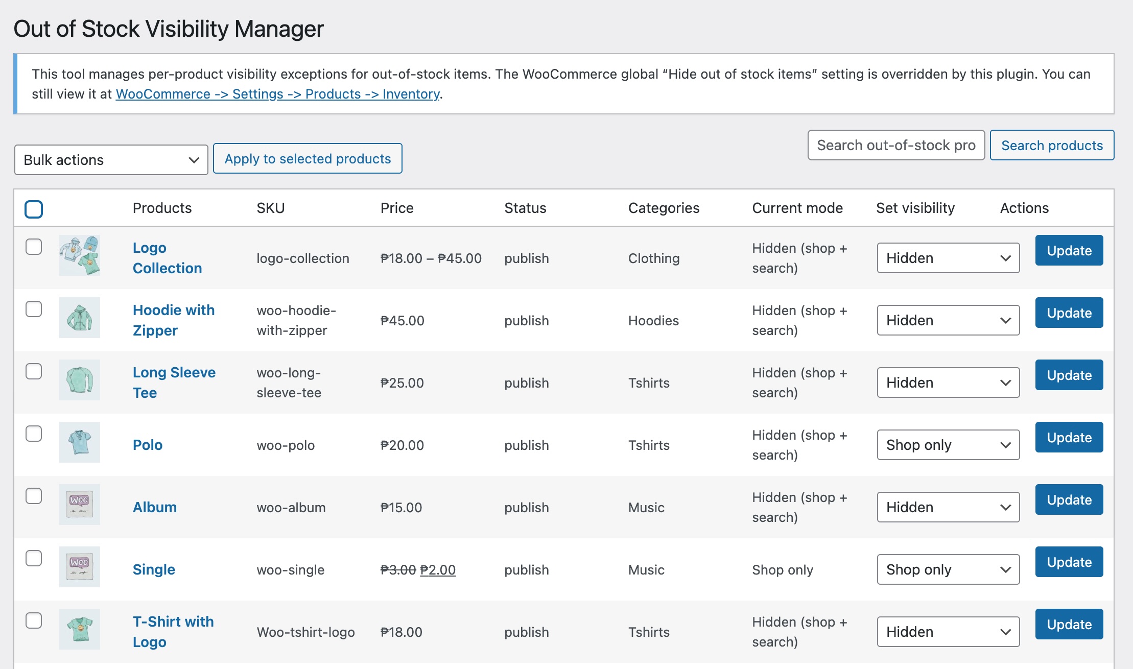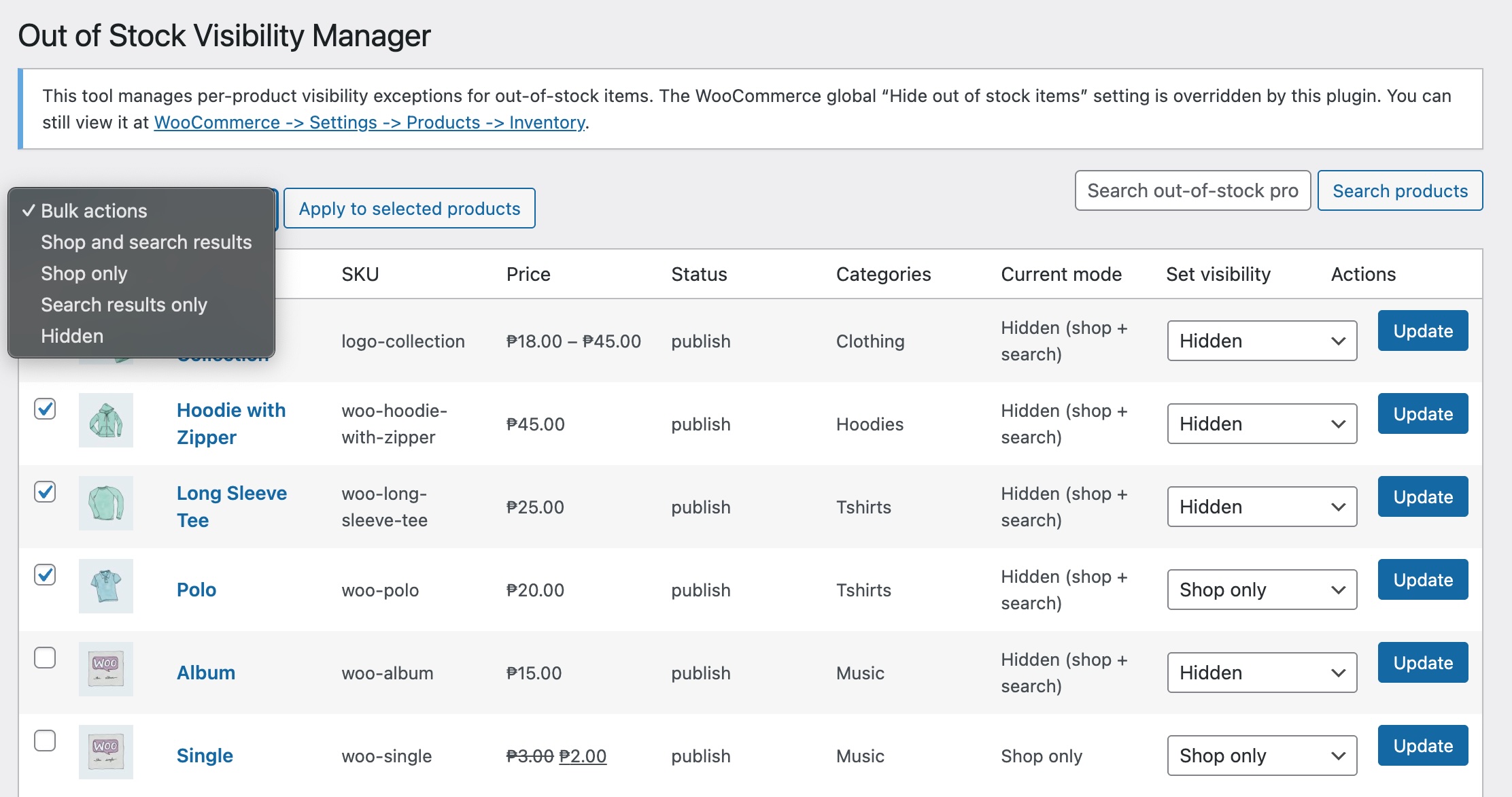 - Choose visibility for out-of-stock products only