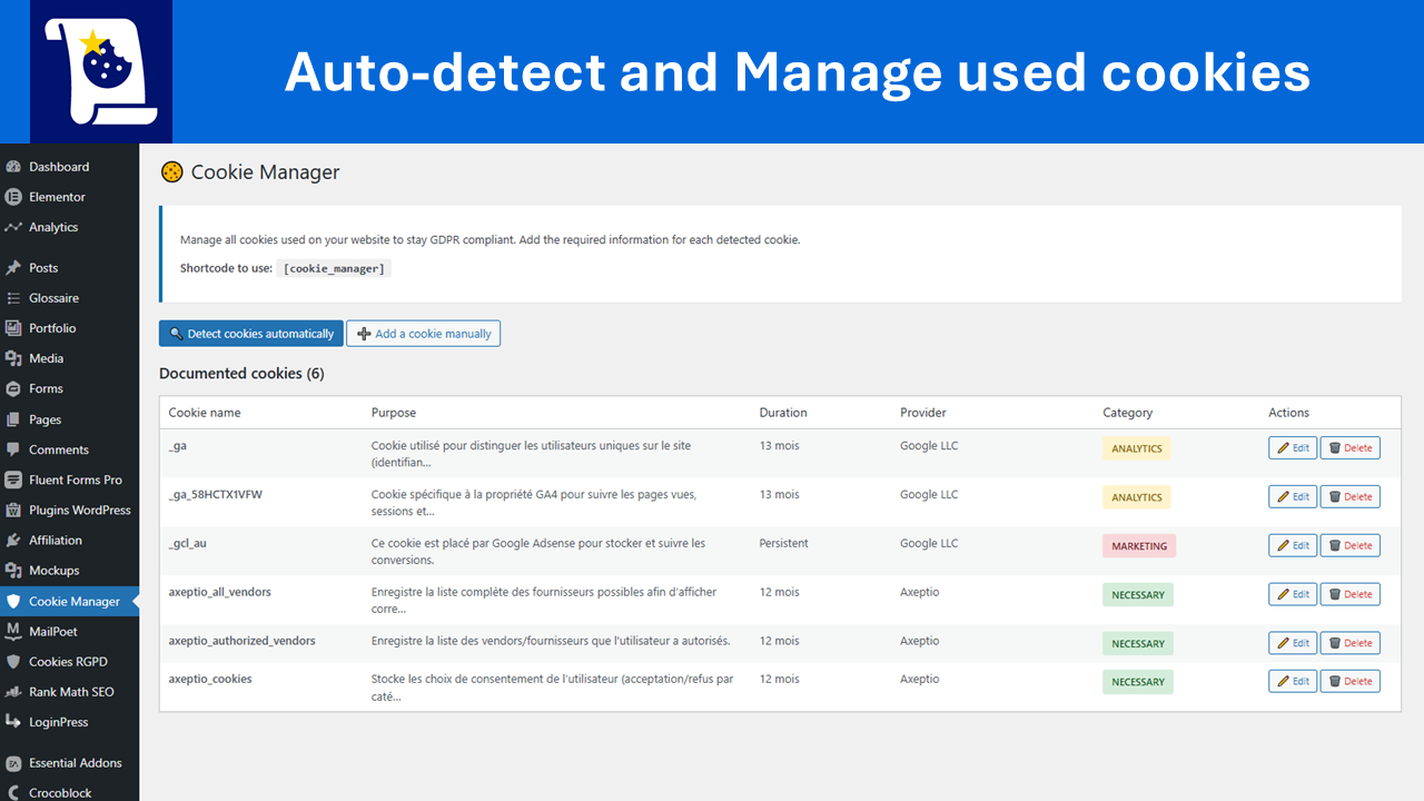 Cookie Manager admin interface showing documented cookies and available actions.