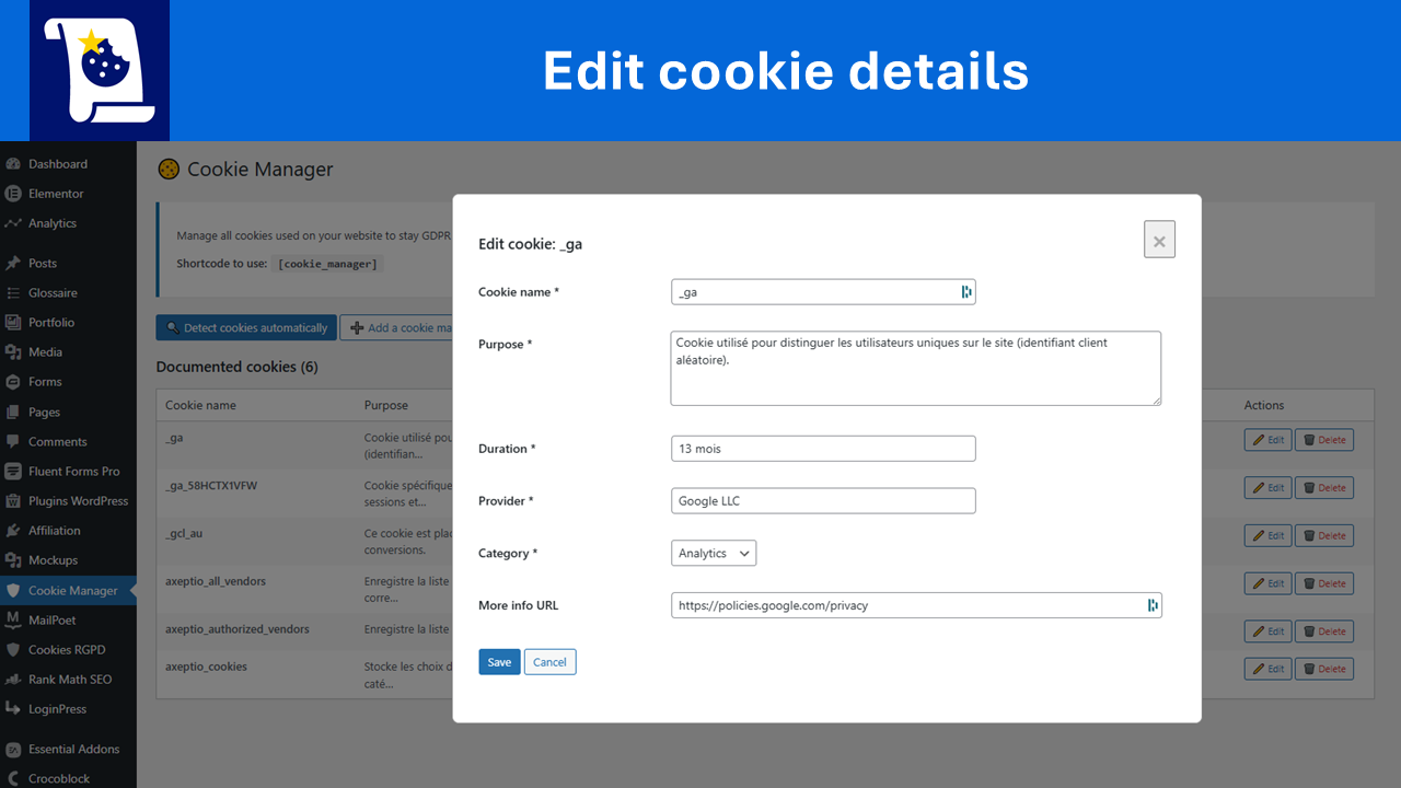 Edit cookie modal with detailed GDPR information (purpose, duration, provider, category).