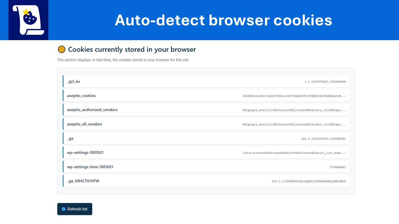 Automatic detection of cookies currently stored in the visitor’s browser.