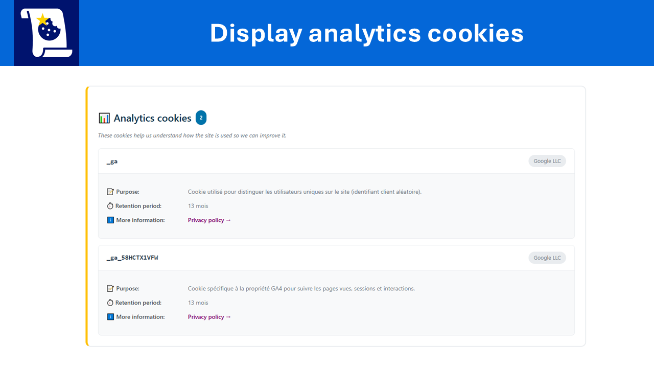 Public display of analytics cookies with clear categorization.