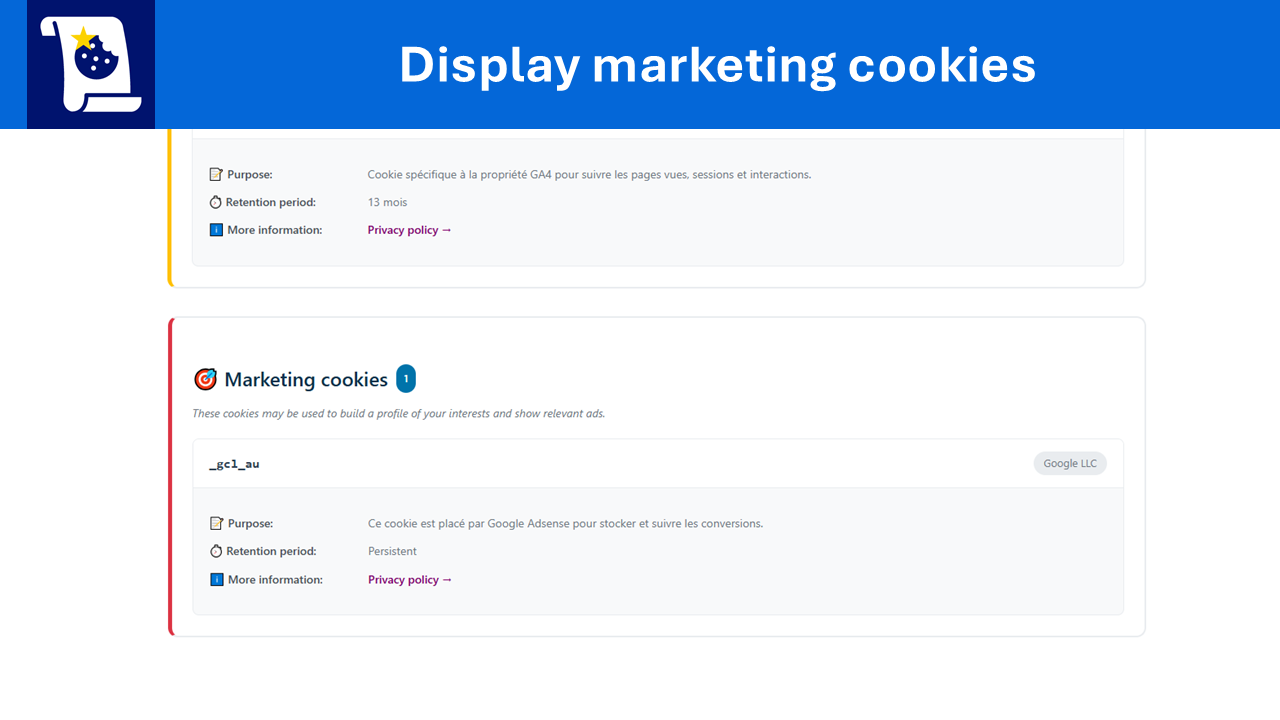 Public display of marketing cookies and retention details.