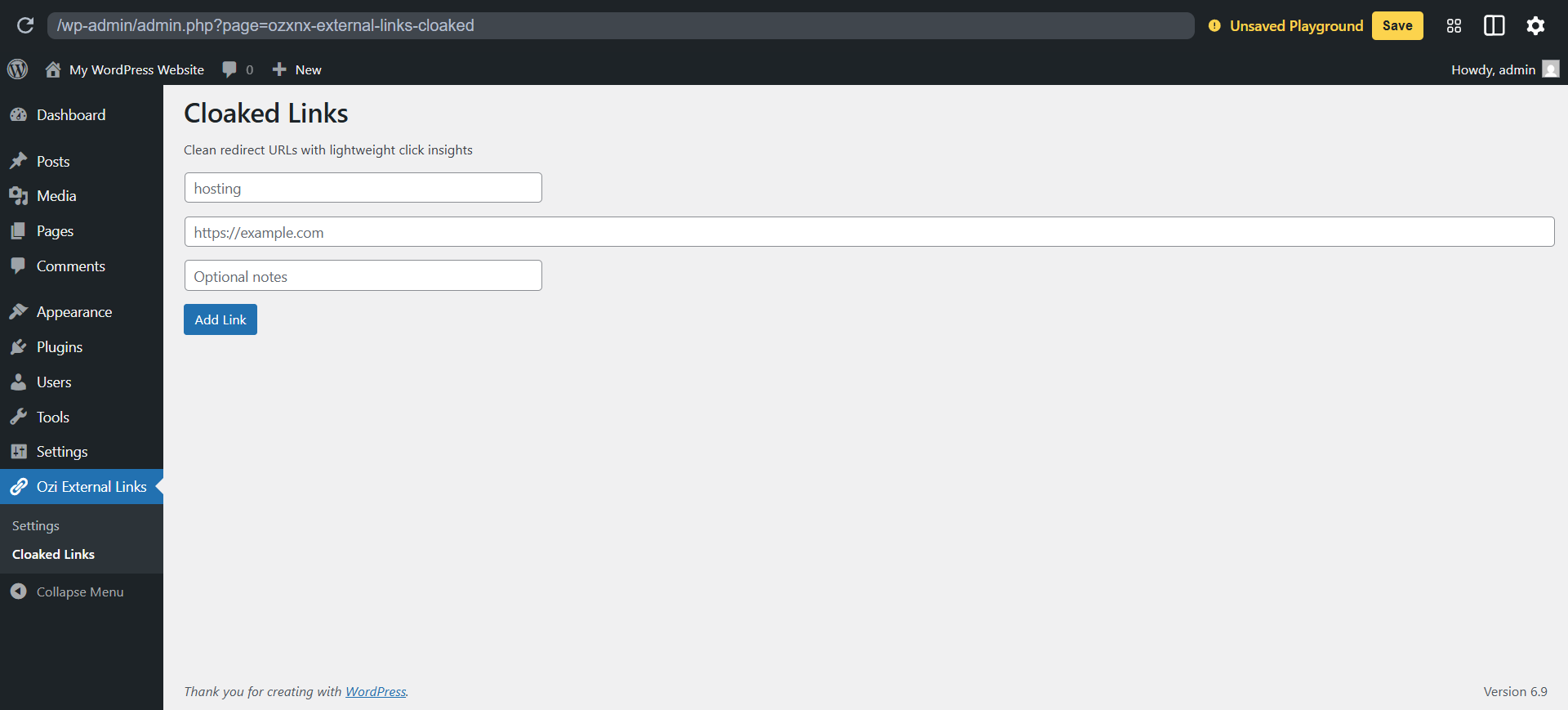 - Go to Ozi External Links Cloaked Links to create and manage redirect links.