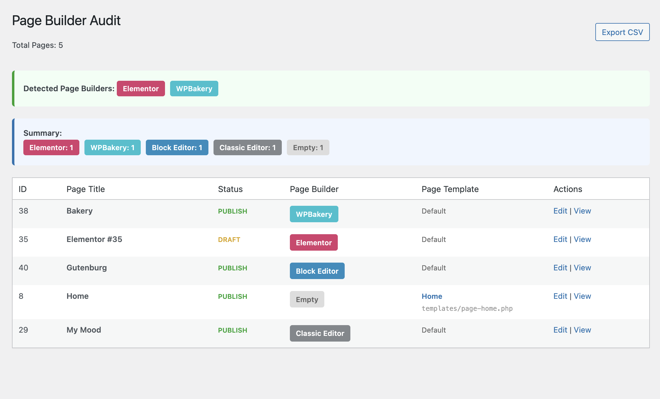 Page Builder Audit provides a simple admin tool to audit all pages on your WordPress site and identify which page builder (if any) each page uses.