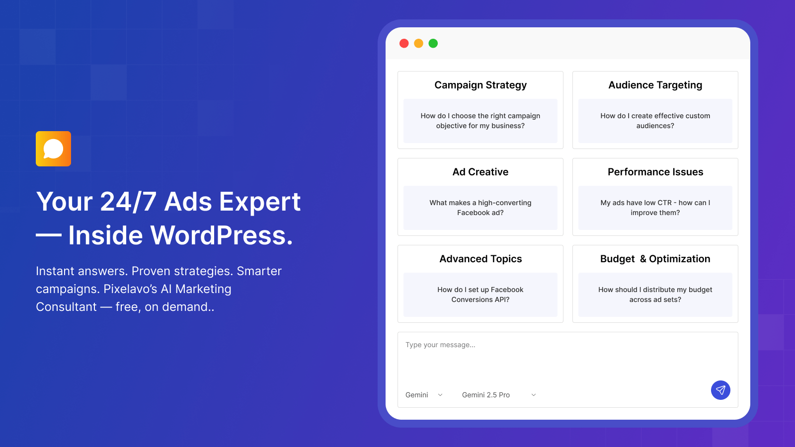- AI Marketing Consultant: Get expert Facebook advertising guidance with an AI-powered marketing consultant available 24/7 in your WordPress dashboard. Ask questions about campaign optimization, targeting strategies, pixel setup, conversion tracking, and advertising best practices. The consultant provides actionable recommendations tailored to your specific business needs, with persistent chat history to track your advertising journey. Powered by OpenAI or Google Gemini, it stays current with the latest Facebook advertising updates including iOS 14.5+ adaptations and Meta Business Suite features.