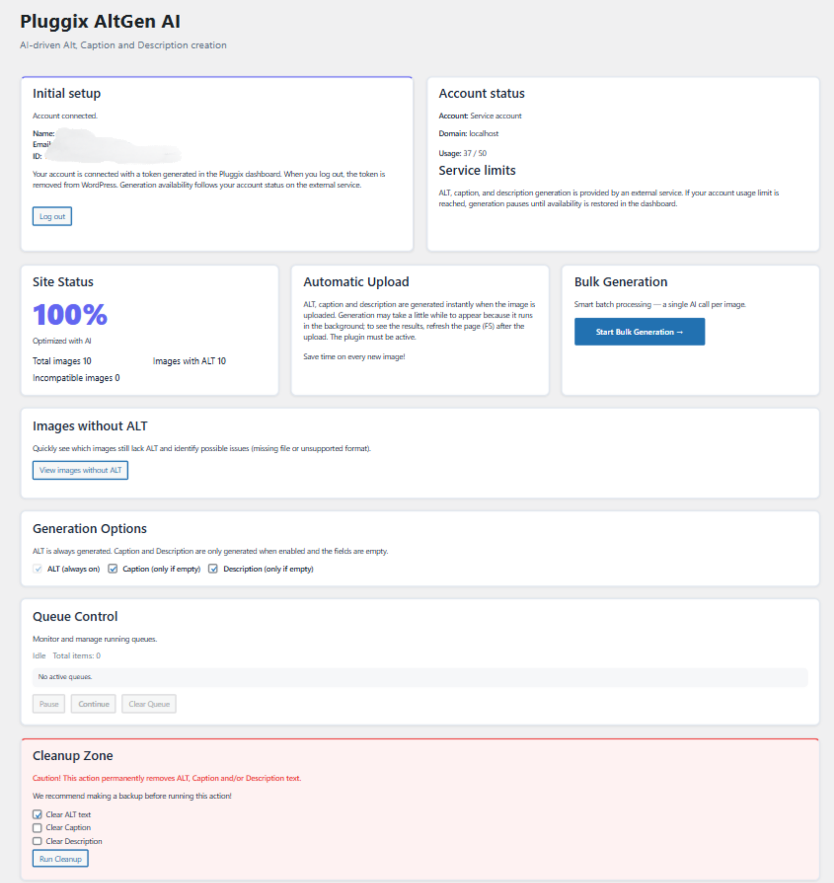 Pluggix AltGen AI automatically generates ALT text, captions and descriptions for images using AI. The plugin processes images on upload and also offers bulk generation for existing libraries, helping accessibility and SEO. AI generation is performed by the external Pluggix service (server-side), not locally inside WordPress.