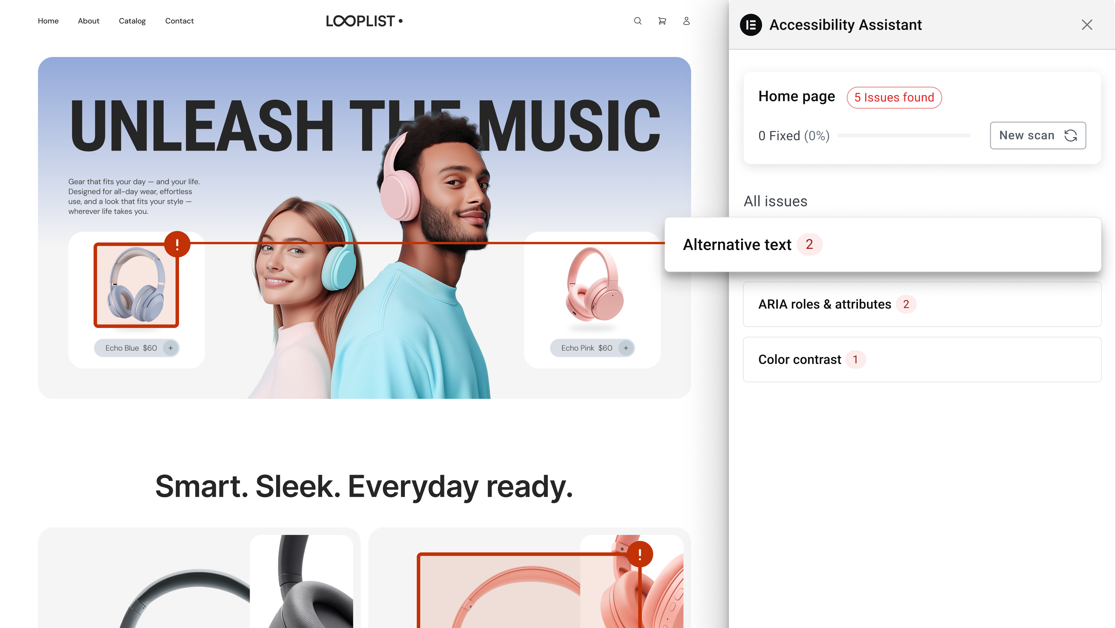 Scan results: View issues highlighted in context and grouped by type such as alt text, ARIA, page structure, and more. Expand any item for step-by-step guidance and optional AI-powered suggestions.