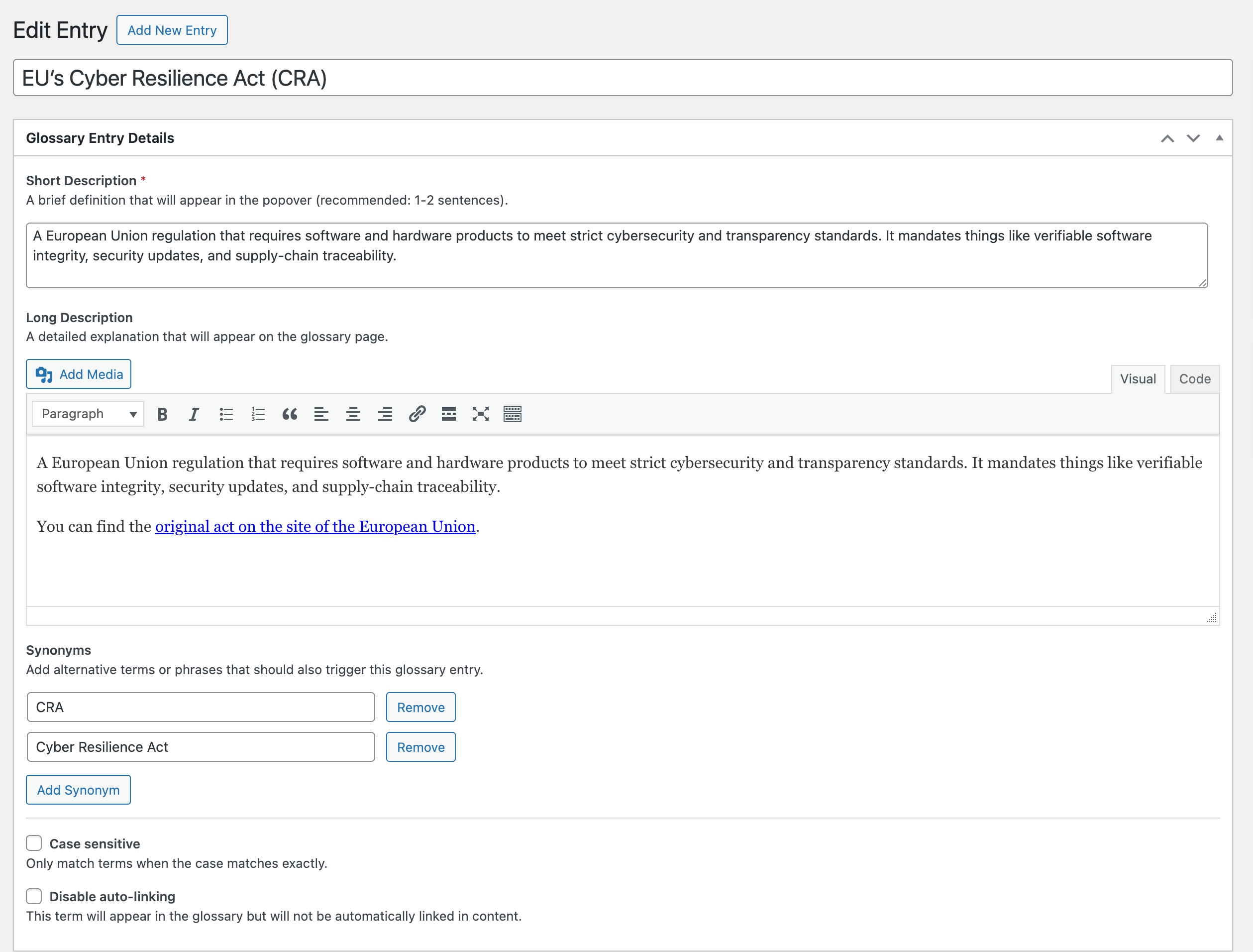 - Disable Auto-Linking: Allow entries to appear in the glossary without being automatically linked in content