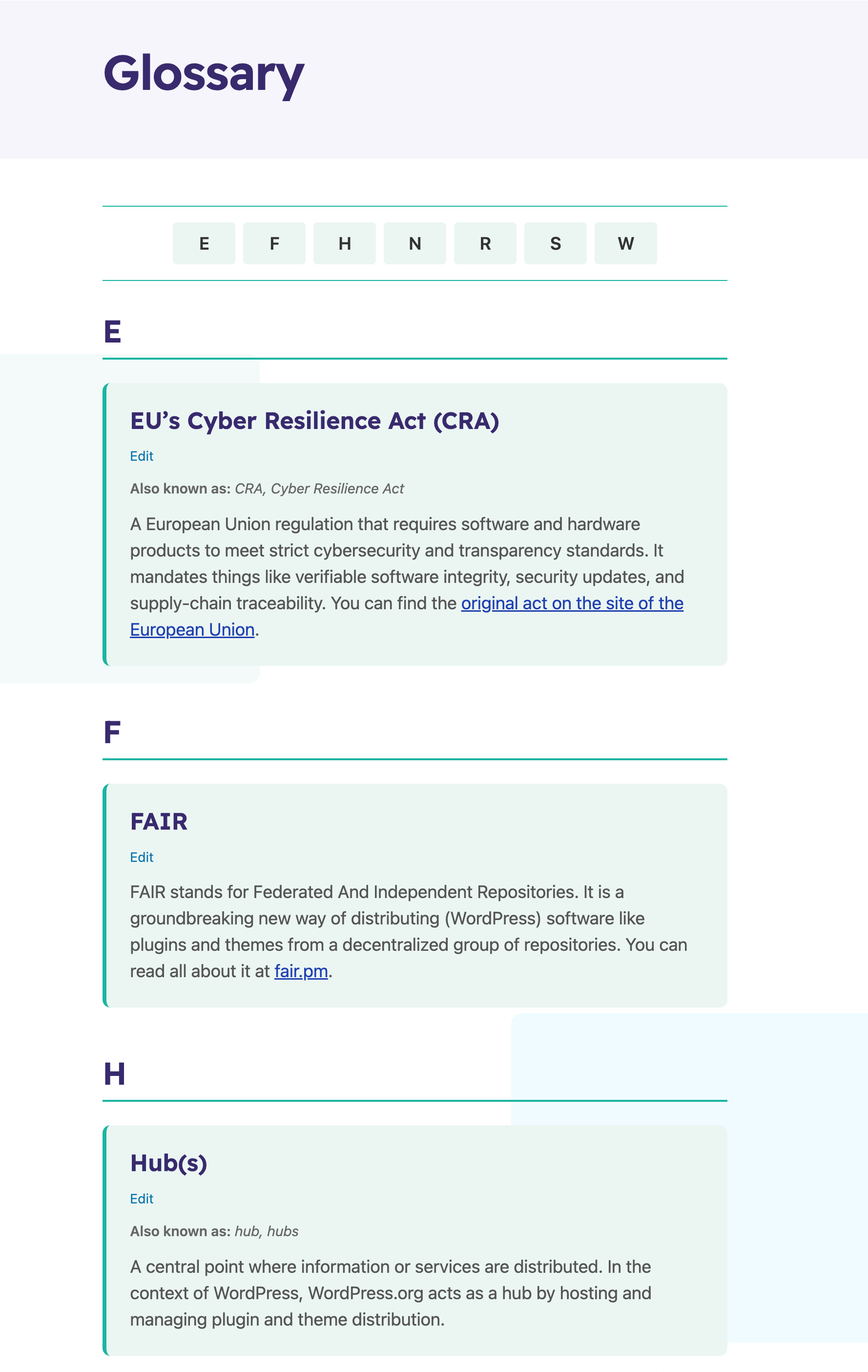 - Glossary Block: Gutenberg block to display full glossary with alphabetical navigation