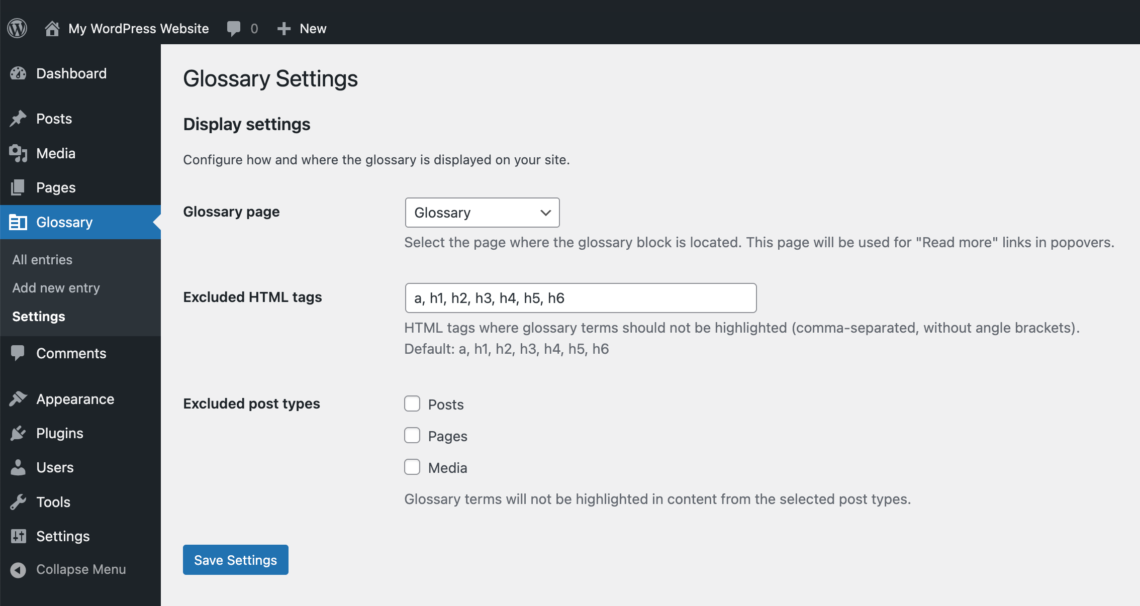 - Configure Settings: Go to Glossary > Settings in the WordPress admin and select the page you created as the "Glossary Page"