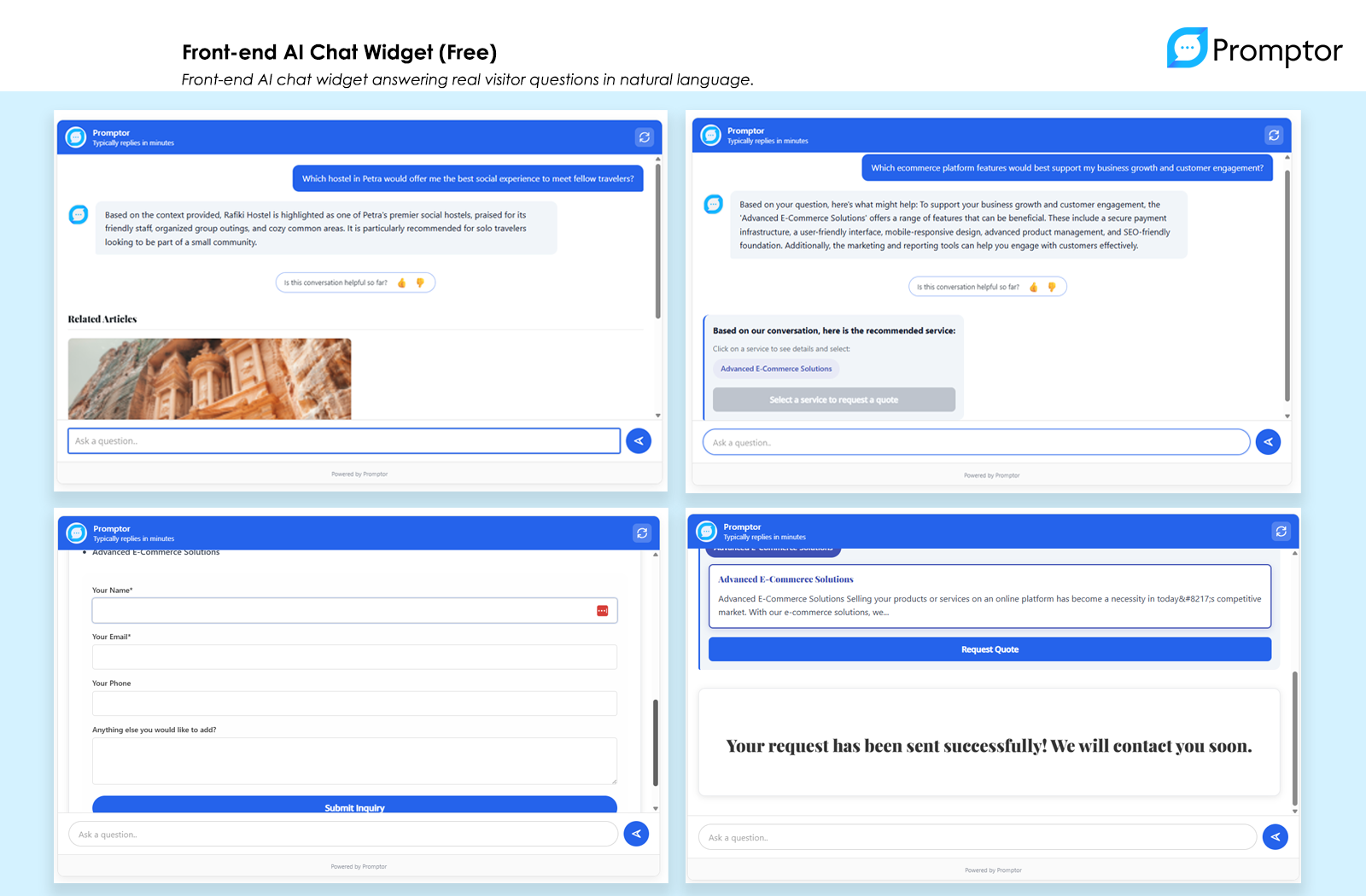 Unlike generic chatbots, Promptor learns directly from your website content. It understands what you offer, provides accurate answers based on your pages and posts, and guides visitors toward taking action—whether that’s requesting a quote, asking about a service, or making a purchase.