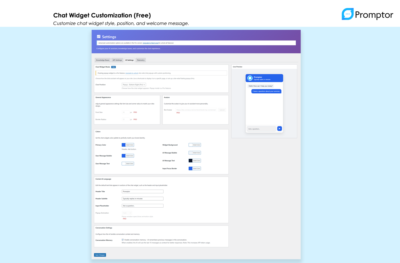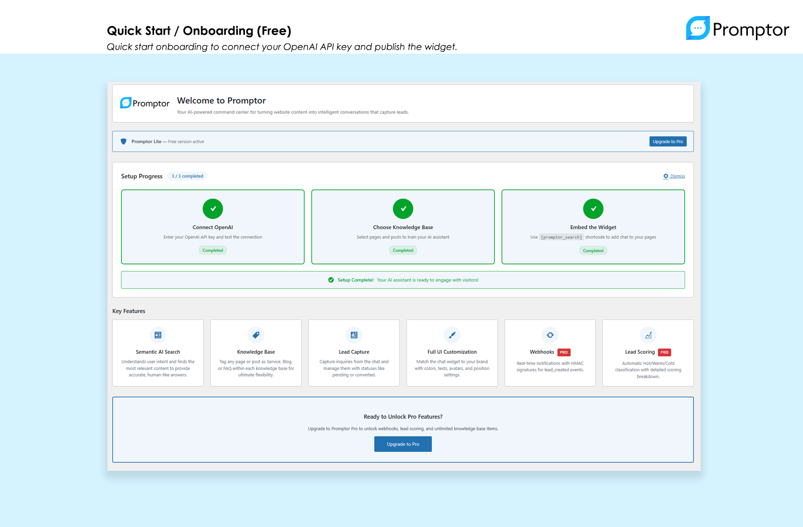 The free version is fully functional with AI chat, lead capture, and up to 3 knowledge base items. Pro removes limits, adds WooCommerce integration, analytics, automations, and white-label branding. Think of Free as “getting started” and Pro as “scaling and optimizing revenue.”