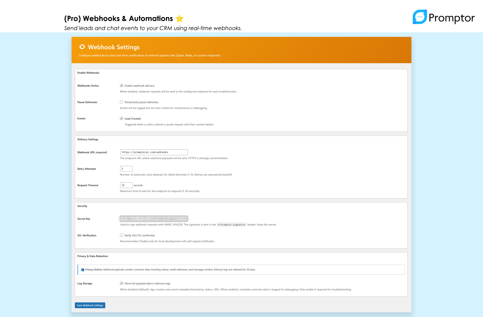 ✓ Webhook Support – Connect to Zapier, Make, or custom automation