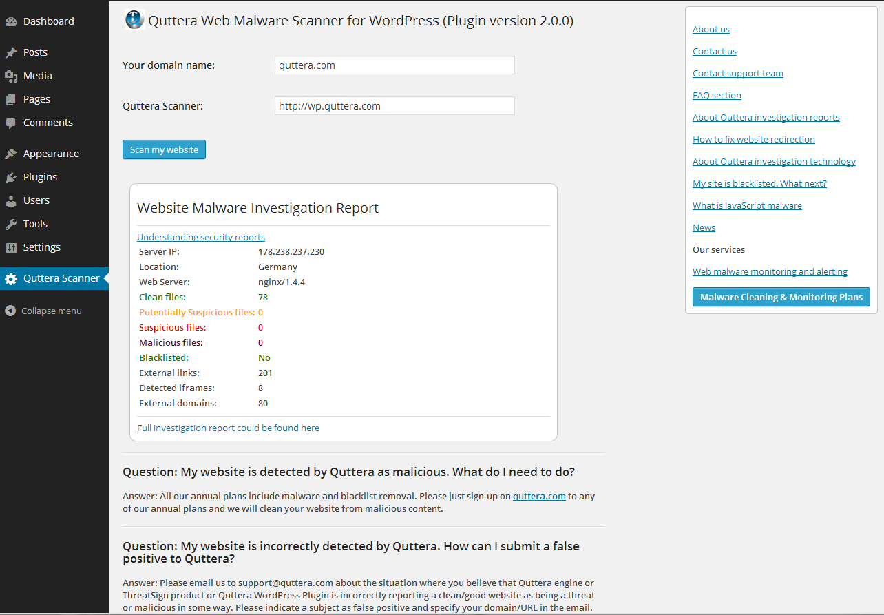 The Quttera Web Malware Scanner plugin will scan your website for malware, trojans, backdoors, worms, viruses, shells, spyware and other threats as well as JavaScript code obfuscation, exploits, malicious iframes, malicious code injection, malicious code obfuscation, auto-generated malicious content, redirects, hidden eval code and more. Also, it will check whether your website is blacklisted by Google and other blacklisting authorities. Help yourself to protect your website, your website users and your online reputation with a free Quttera Web Malware Scanner plugin.