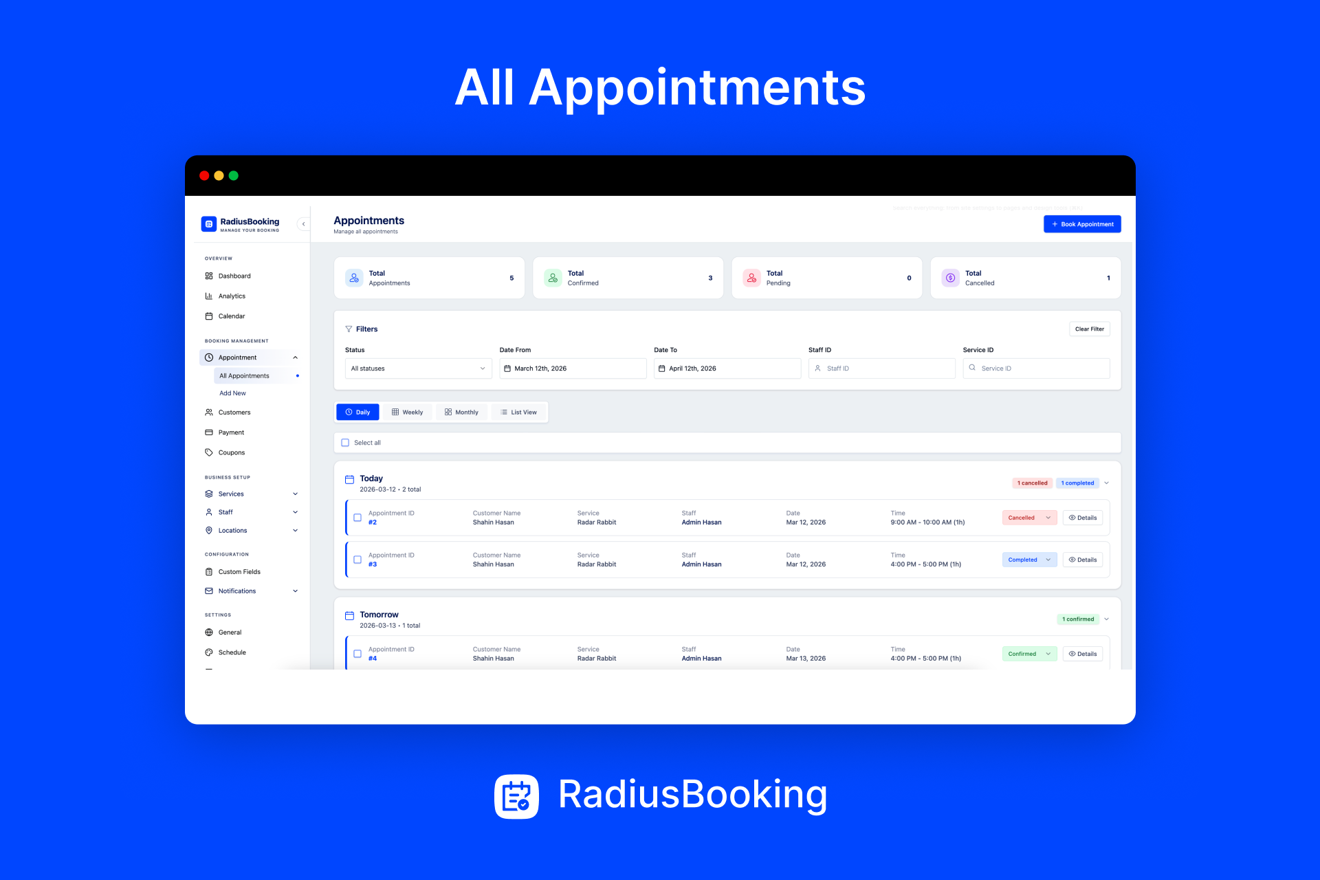 RadiusBooking is specifically designed for service businesses like salons and clinics. Features like staff scheduling, service duration settings, buffer times between appointments, and customer management address the exact needs of appointment-based businesses in beauty, wellness, and healthcare industries.