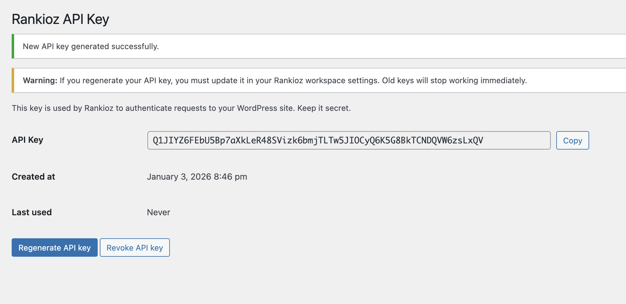The old key will stop working immediately. Update the key in your Rankioz workspace settings after regenerating.