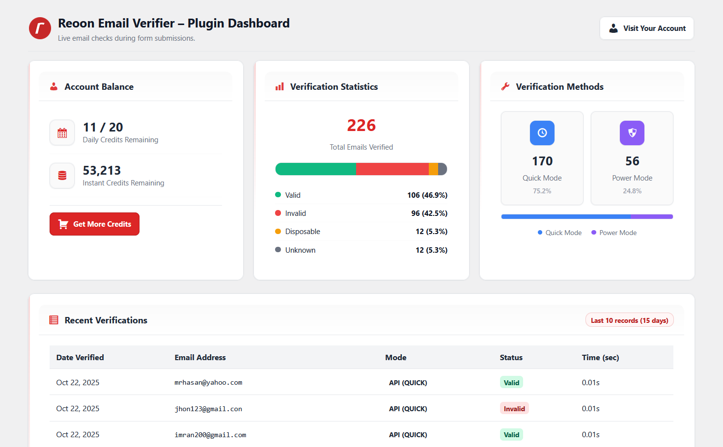 This plugin integrates with the Reoon Email Verifier service (https://www.reoon.com/email-verifier/) to provide real-time email verification functionality. Through API calls to Reoon Technology’s servers, it verifies email addresses and retrieves account information, using the following endpoints: