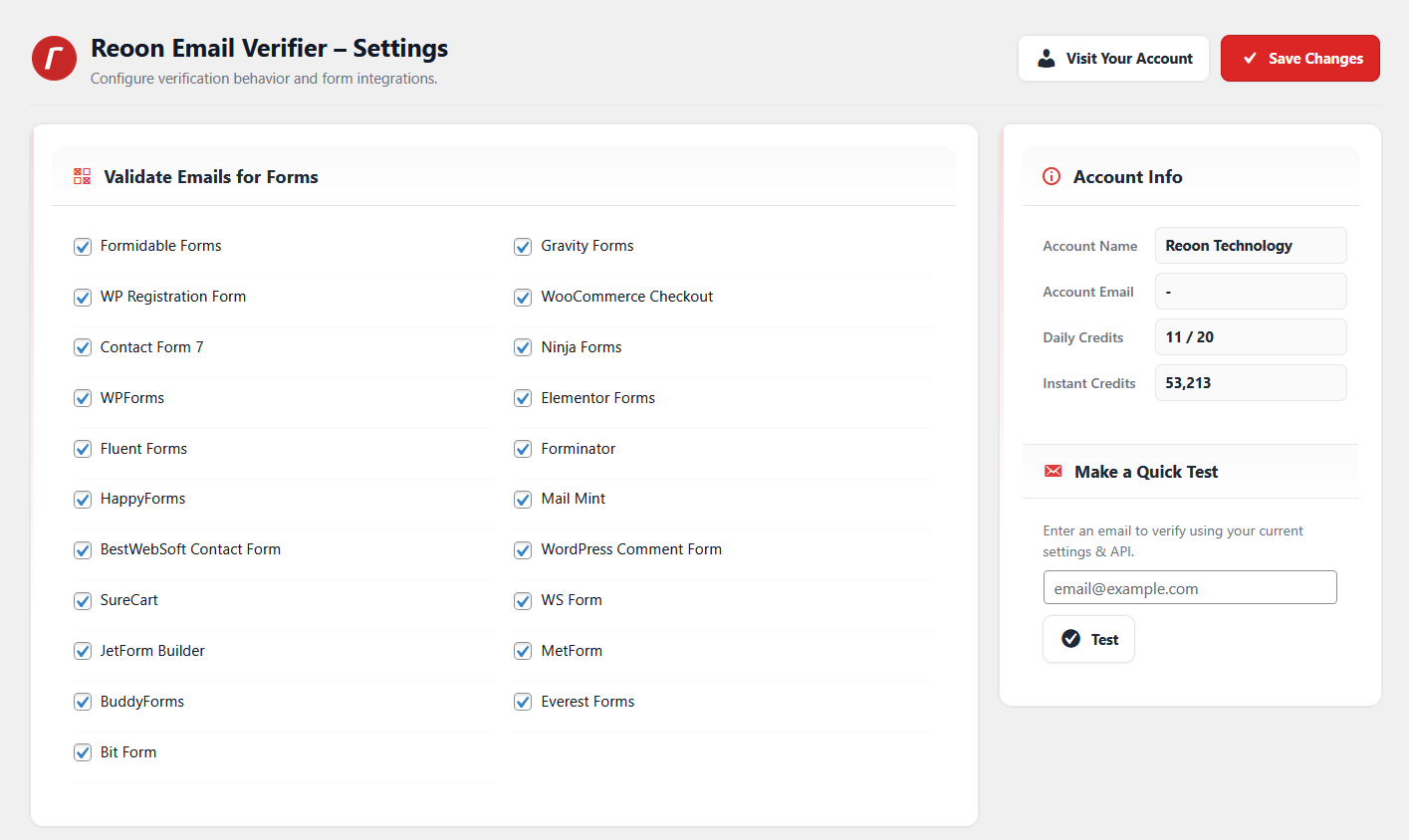 Reoon Email Verifier offers a robust solution for verifying email addresses in real-time, protecting your site from spam registrations and enhancing email campaign effectiveness. With over 99% accuracy, our verification service integrates seamlessly with popular WordPress forms, offering broad compatibility and exceptional reliability.