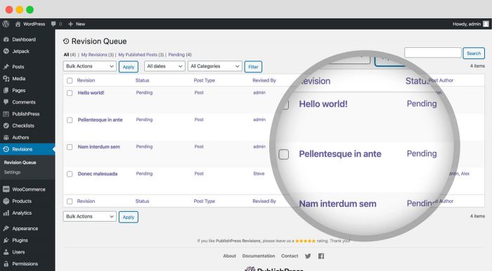 Manage and Moderate Revisions: PublishPress Revisions has a Revision Queue screen where you can search, approve, or deny changes to a published post's content.