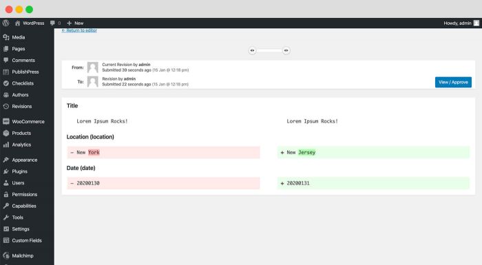 - Click “Compare” and you can see what’s changed in this revision. The “Compare” screen will show you any changes that have happened with ACF Fields.